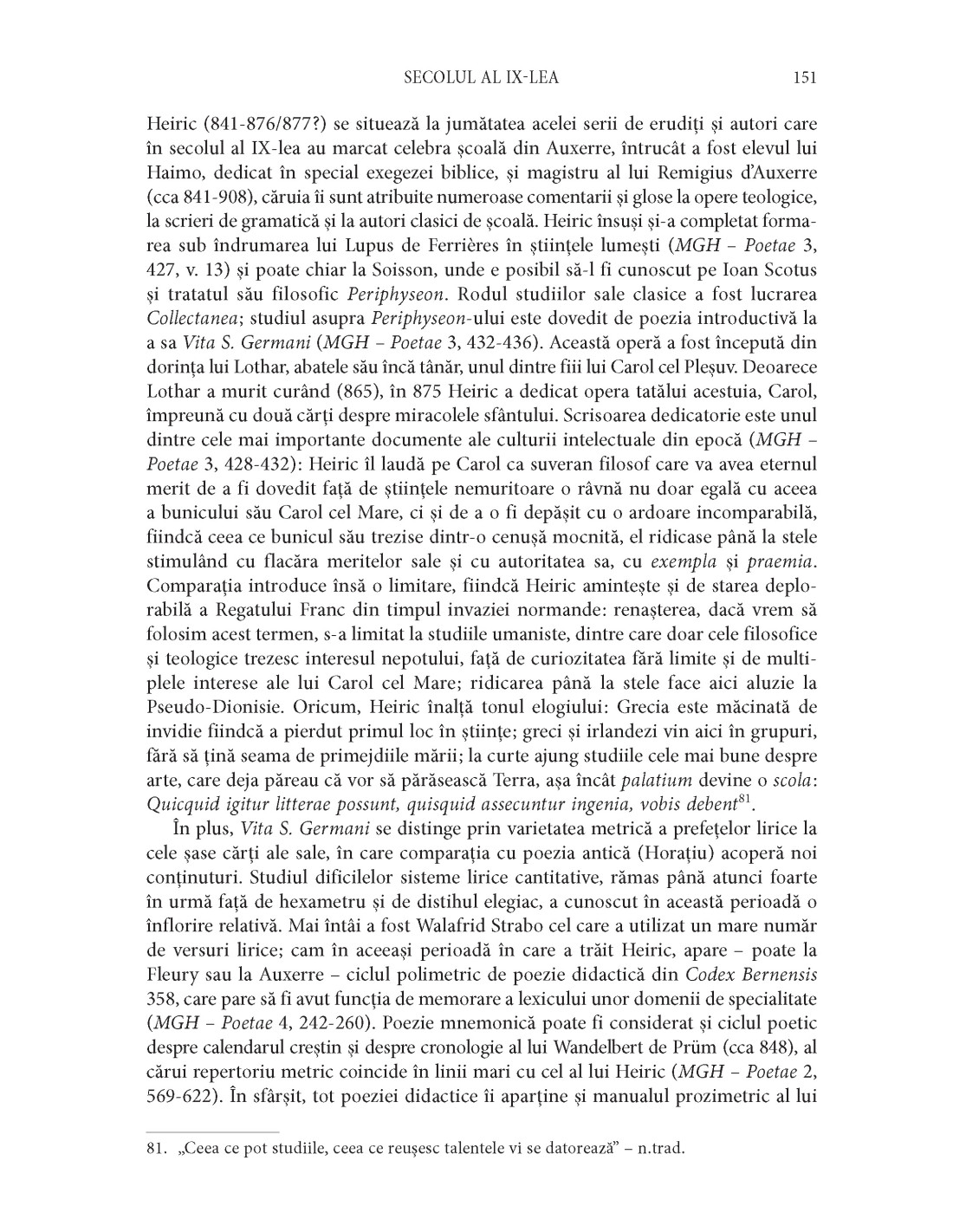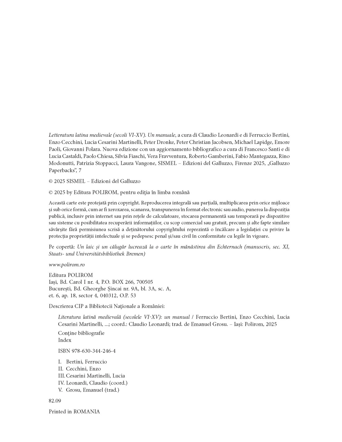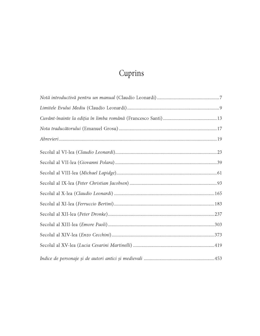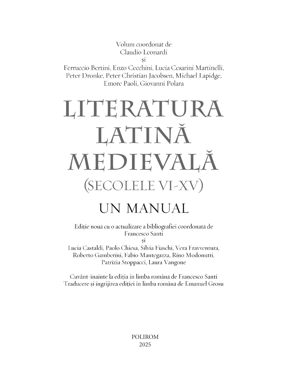Studierea Evului Mediu prin prisma literaturii pe care a produs-o poate modifica radical nedreapta percepție comună asupra acestui mileniu de istorie. „Pe umerii giganților”, potrivit unei expresii atribuite lui Bernard de Chartres, adică exploatând valorile Antichității greco-latine, autorii Evului Mediu au creat opere originale în care varietatea temelor și a perspectivelor de abordare ține pasul cu mutațiile sociopolitice ale vremii și cu preferințele diverse și schimbătoare ale unui public răspândit pe aproape tot cuprinsul Europei. Cu un canon de autori greu de definit, literatura latină medievală surprinde și fascinează în același timp prin complexitate: genurilor consacrate în Antichitatea clasică li s-au adăugat altele, iar tendinței tenace de a interpreta și a reprezenta lumea prin autoritatea primilor gânditori creștini i s-au alăturat cu timpul puncte de vedere mai raționale și mai realiste. Realizat de un colectiv de reputați medieviști, Manualul propus de Società Internazionale per lo Studio del Medio Evo Latino oferă o perspectivă sintetică și integratoare asupra producției literare medievale de limbă latină: genuri, opere, autori, curente și școli de gândire jalonează întreaga evoluție, divizată pe secole, a literaturii din epocă. Adresat în primul rând profesorilor, cercetătorilor și studenților din toate ciclurile de studiu ale disciplinelor umaniste, dar și unui public mai larg interesat de istoria patrimoniului cultural european, Manualul oferă informații fundamentale cu privire la evoluția și semnificația unei literaturi care exaltă latina atât ca limbă de creație, cât și ca vehicul de transmitere a cunoașterii.