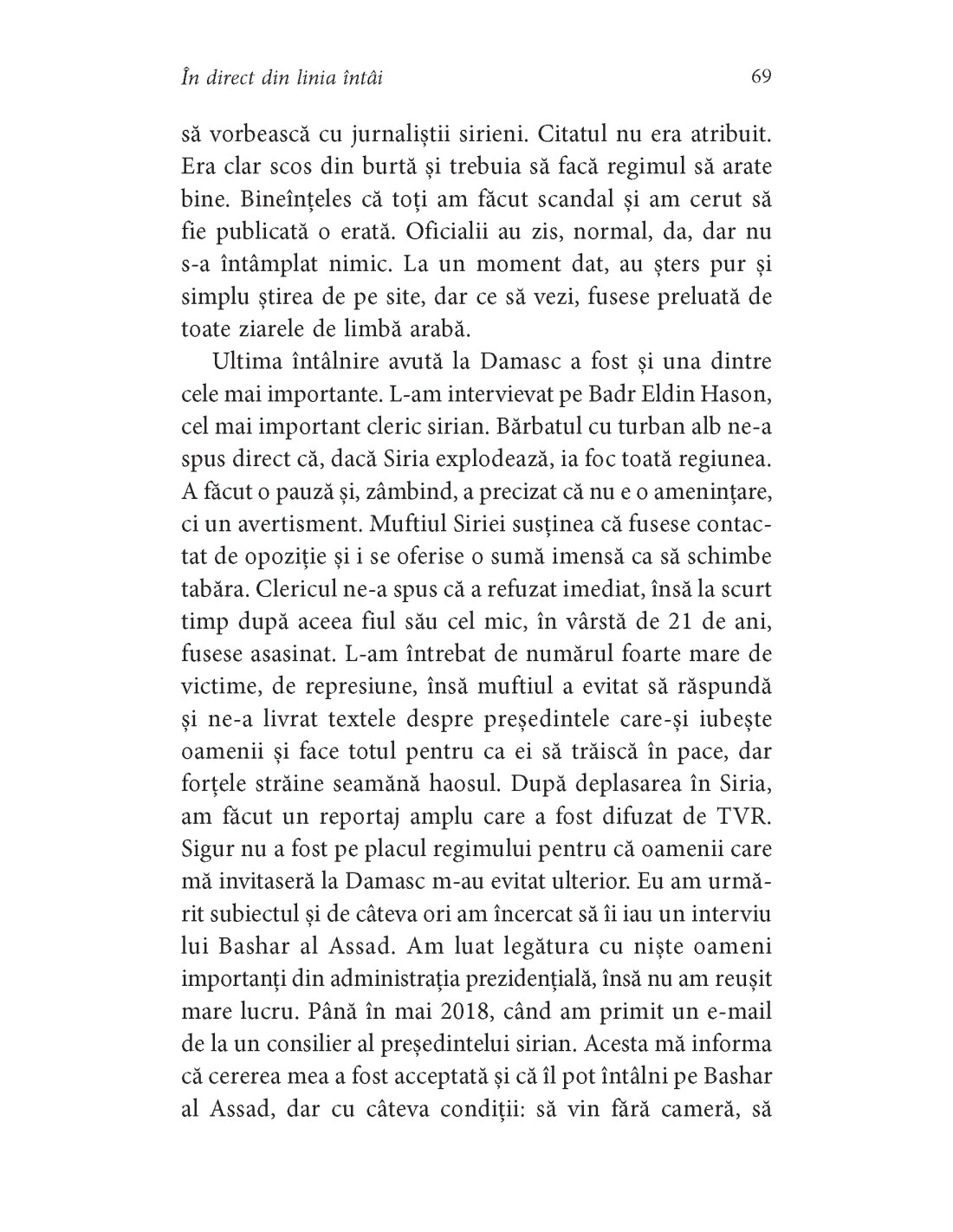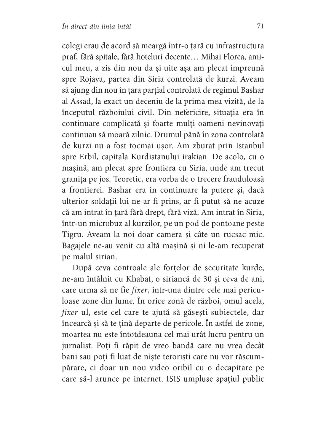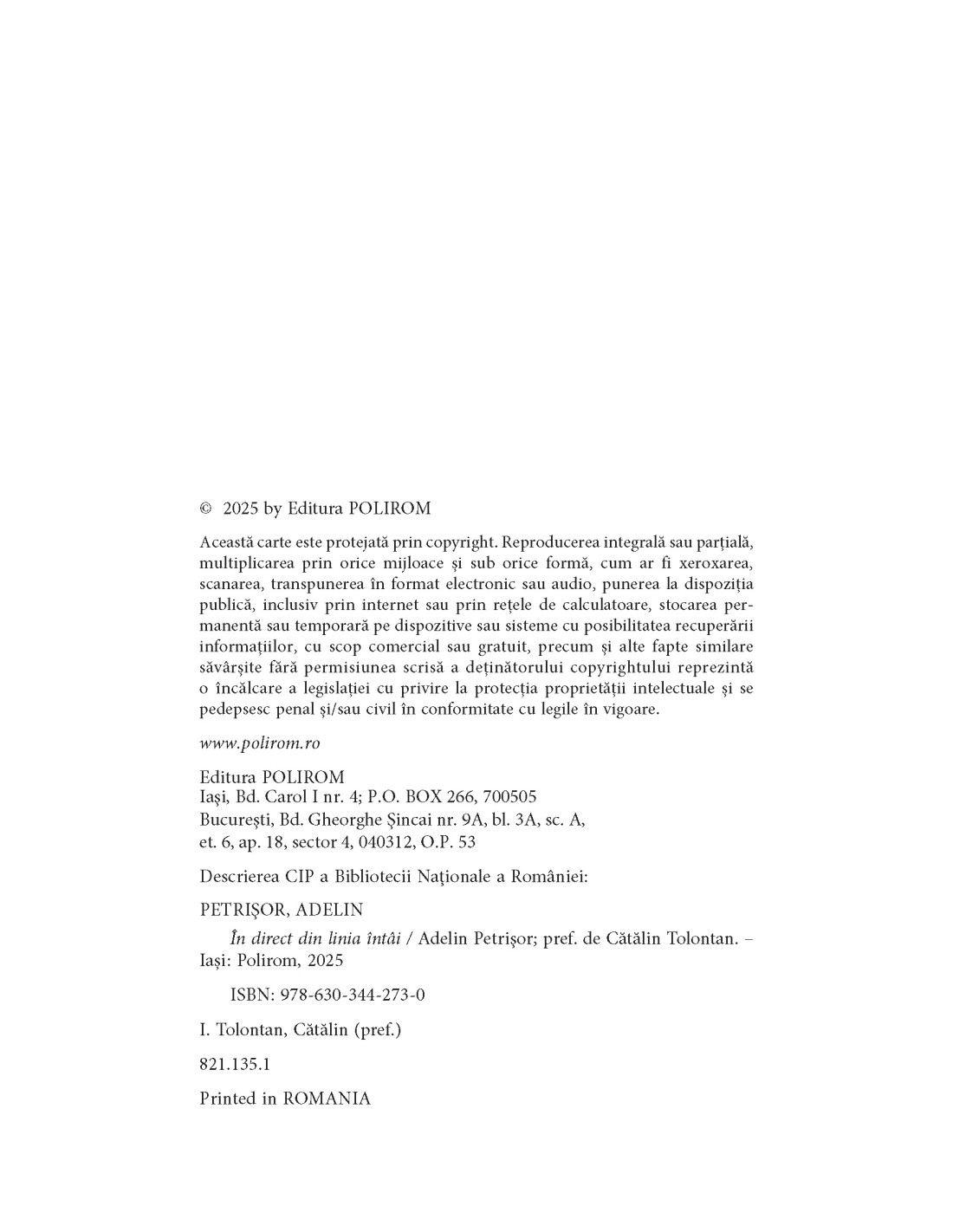 „Când o mie de oameni fug într-o direcție și doar câțiva aleg să alerge spre ceea ce i-a gonit pe semenii lor, o parte dintre cei care înaintează pe contrasens sunt jurnaliști. România a avut mai multe generații temerare de ziariști de război, după 1990. Puțini au izbutit să rămână timp de decenii în profesie, mai ales la vârf, așa cum a făcut-o Adelin Petrișor. Poveștile volumului În direct din linia întâi vin într-un moment în care noi toți descoperim războiul. Ani de zile, Adelin Petrișor a transmis dintr-o lume îndepărtată nu doar geografic, ci și diferită ca înțeles al faptelor. Orientul Mijlociu și Asia, Africa, Balcanii de Vest, toate acestea păreau războaiele altora, chiar dacă militarii noștri erau acolo. Acum, războiul a venit lângă noi și a deschis un cuprinzător evantai al întrebărilor, temerilor și contestărilor. Nu știm ce urmează. Dar, de vreme ce nu putem prezice viitorul, ne putem strădui să înțelegem ce s-a întâmplat în trecut. Această țesătură a timpului și a evenimentelor, compusă din discuțiile cu oamenii obișnuiți, cu militarii și cu cei care au responsabilitatea politică, este de neînlocuit, dacă vrem să fim, ca țară, realiști și curajoși.” (Cătălin Tolontan)
