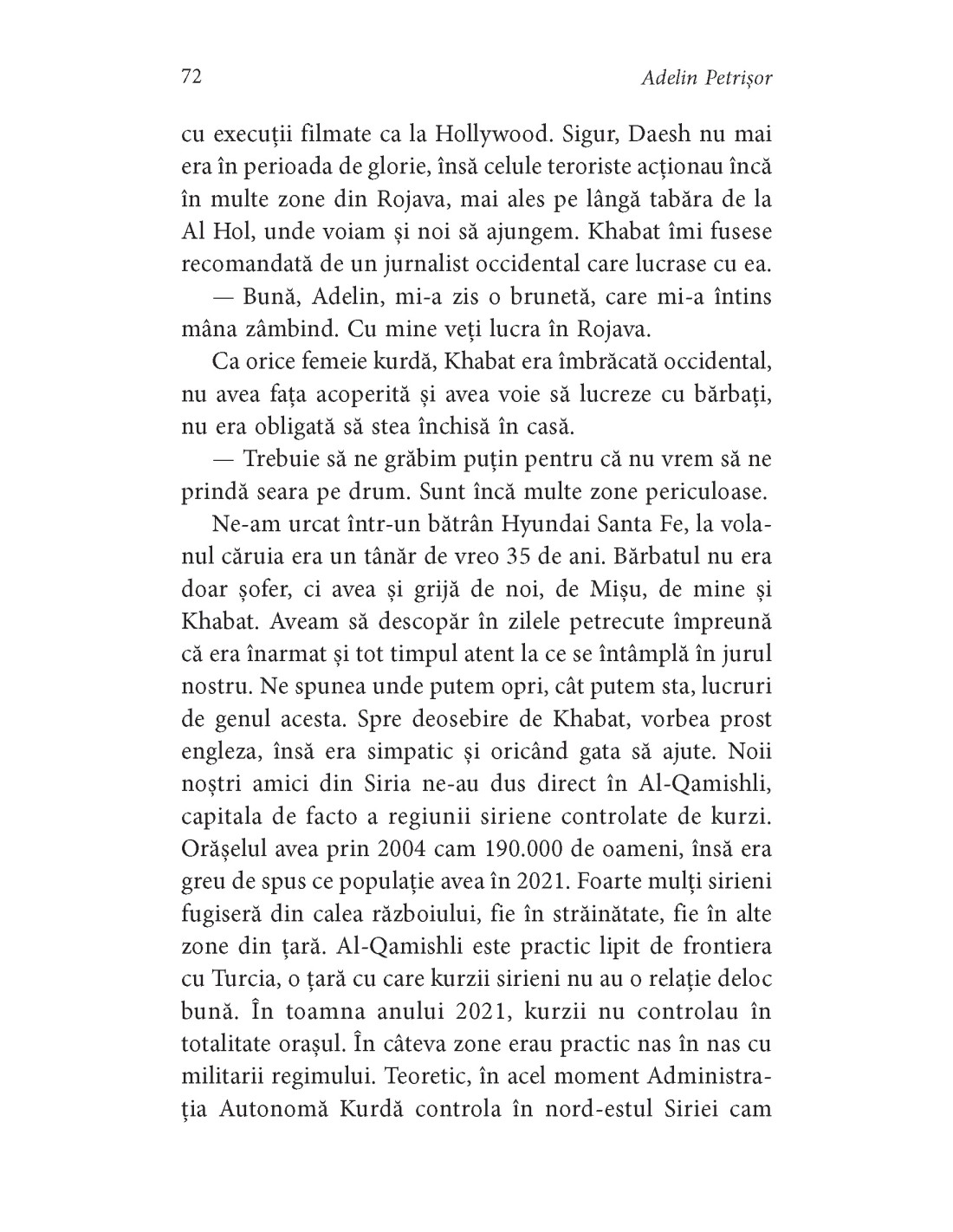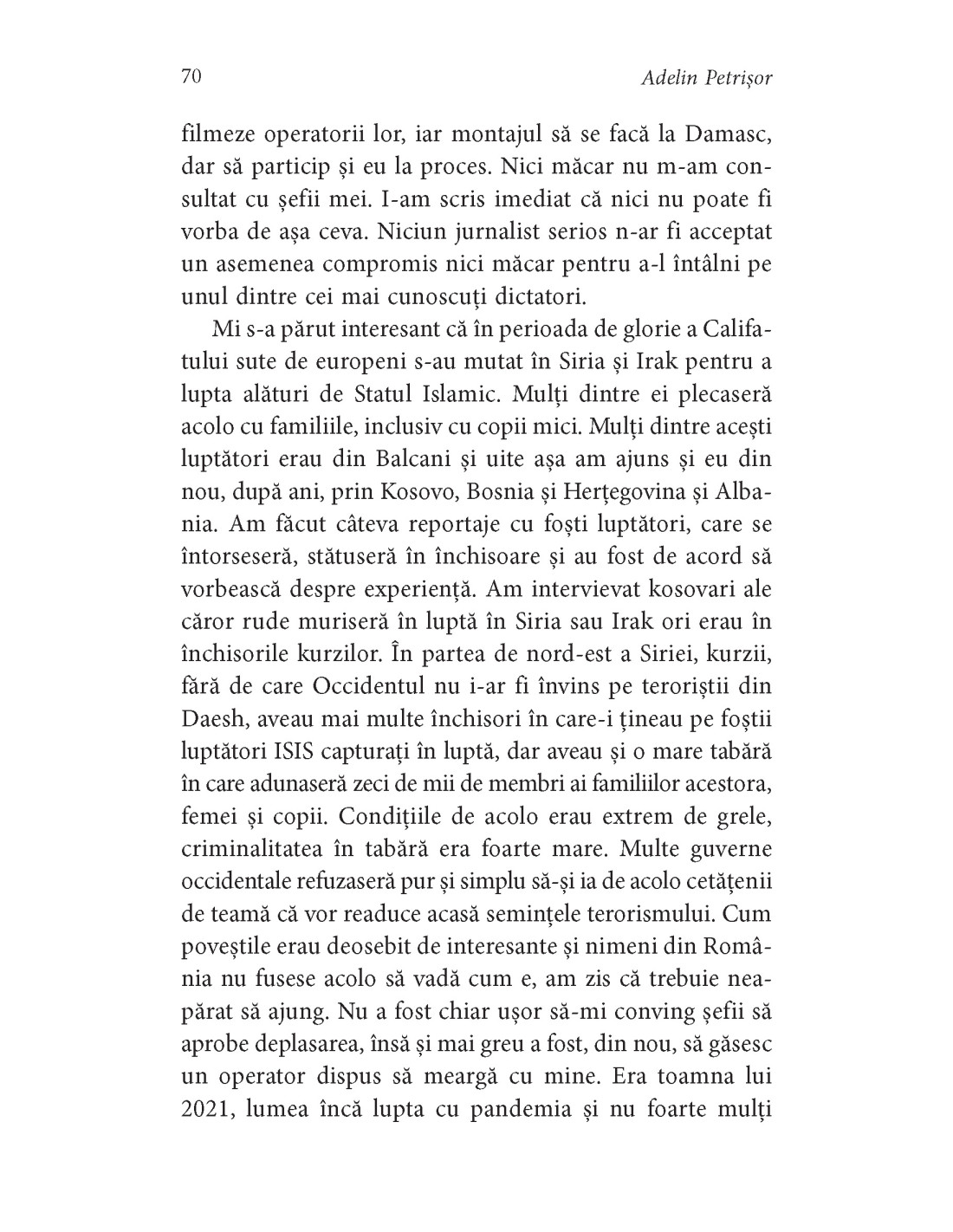 Adelin PETRIȘOR (n. 1975) este unul dintre cei mai cunoscuți jurnaliști de război din România. Și-a început cariera în 1994, la radio. A lucrat la diferite posturi TV, iar în prezent este corespondent special al televiziunii publice. A transmis din Irak, Afganistan, Liban, Israel, Algeria, Albania, Egipt, Tunisia, Siria și alte zone de conflict. De-a lungul timpului a intervievat personalități precum Yasser Arafat, Ehud Barak, Beniamin Netanyahu, Valentino Rossi, ayatollahul Mohammad Fadlallah, Jaap de Hoop Scheffer. A fost distins cu Marele Premiu APTR în 2003, Premiul pentru cel mai bun reportaj în 2007 și Premiul pentru documentar politic în 2009. În 2012 a participat la International Photography Awards (Los Angeles) cu cinci fotografii realizate în Coreea de Nord, fiind printre finaliștii la Marele Premiu „Discovery of the year” și adjudecându-și premiul la secțiunea „Editorial Non-Pro”. Documentarul Coreea de Nord, nimic de invidiat a rulat la TIFF în 2012. În 2013 a fost ales în selecția oficială la Astra Film Festival Sibiu, unul dintre cele mai importante festivaluri de documentare din Europa de Est. La Editura Polirom a mai publicat Războaiele mele (2010, 2013), Țara cu un singur gras (2013, 2020) și albumul de fotografii Coreea de Nord, un lagăr cât o țară (2012), care a fost publicat și la Seul, în 2016, de Hollym International Corp., în engleză și coreeană.