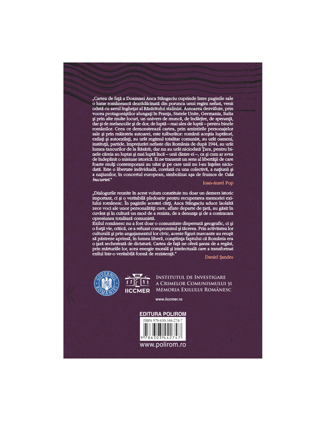 „Dialogurile reunite în acest volum constituie nu doar un demers istoric important, ci și o veritabilă pledoarie pentru recuperarea memoriei exilului românesc. În paginile acestei cărți, Anca Stângaciu aduce laolaltă zece voci ale unor personalități care, aflate departe de țară, au găsit în cuvânt și în cultură un mod de a rezista, de a denunța și de a contracara opresiunea totalitară comunistă.