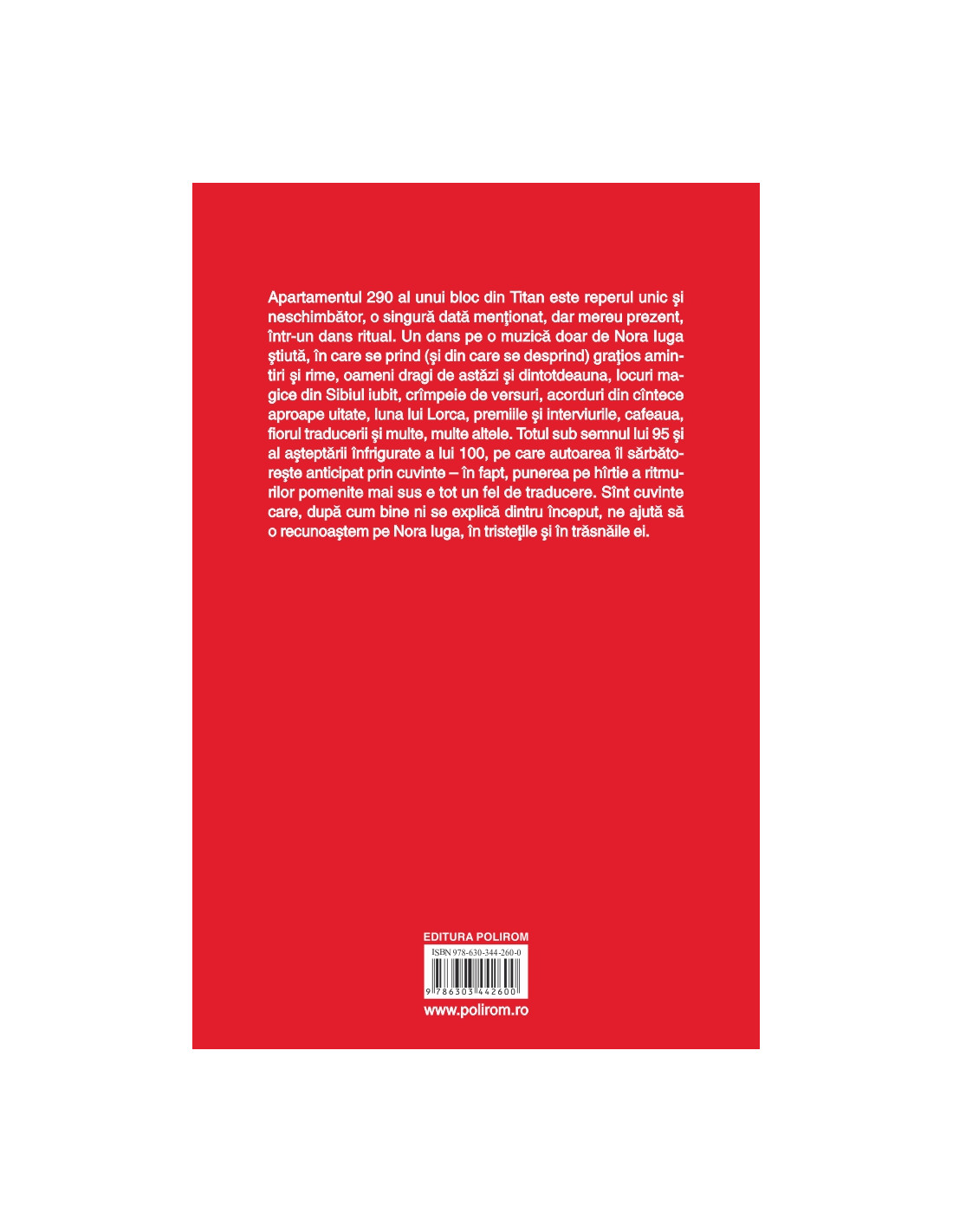 Apartamentul 290 al unui bloc din Titan este reperul unic și neschimbător, o singură dată menționat, dar mereu prezent, într-un dans ritual. Un dans pe o muzică doar de Nora Iuga știută, în care se prind (și din care se desprind) grațios amintiri și rime, oameni dragi de astăzi și dintotdeauna, locuri magice din Sibiul iubit, crâmpeie de versuri, acorduri din cântece aproape uitate, luna lui Lorca, premiile și interviurile, cafeaua, fiorul traducerii și multe, multe altele. Totul sub semnul lui 95 și al așteptării înfrigurate a lui 100, pe care autoarea îl sărbătorește anticipat prin cuvinte – în fapt, punerea pe hârtie a ritmurilor pomenite mai sus e tot un fel de traducere. Sunt cuvinte care, după cum bine ni se explică dintru început, ne ajută să o recunoaștem pe Nora Iuga, în tristețile și în trăsnăile ei.
