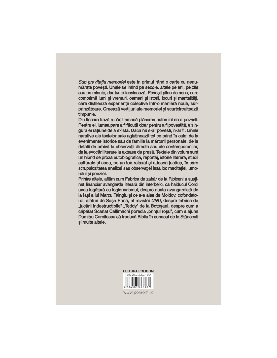 Sub gravitația memoriei este în primul rând o carte cu nenumărate povești. Unele se întind pe secole, altele pe ani, pe zile sau pe minute, dar toate fascinează. Povești pline de sens, care comprimă lumi și vremuri, oameni și istorii, locuri și mentalități, care distilează experiențe colective într-o manieră nouă, surprinzătoare. Creează vertijuri ale memoriei și scurtcircuitează timpurile.