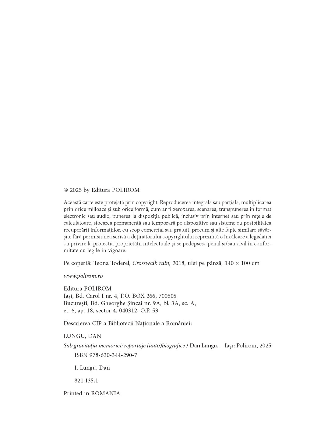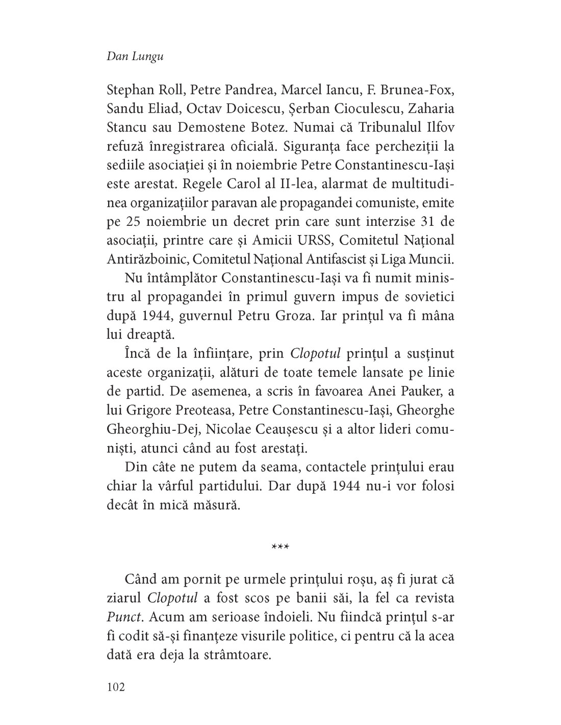 Dan LUNGU (n. 1969) este unul dintre cei mai apreciați scriitori români, cărți ale sale fiind traduse în numeroase limbi. La Editura Polirom a mai publicat volumele de proză scurtă Băieți de gașcă (ed. I, 2005; ed. a II-a, 2013), Proză cu amănuntul (ed. a II-a, 2008) și Părul contează enorm (2019), romanele Raiul găinilor (ed. I, 2004; ed. a II-a, 2007; ed. a III-a, 2010; ed. a IV-a, 2012), Sunt o babă comunistă! (ed. I, 2007; ed. a II-a, 2010; ed. a III-a, 2011; ed. a IV-a, 2013; ecranizat în 2013, în regia lui Stere Gulea; ed. a V-a, 2017; ed. a VI-a, ediție aniversară * 15 ani de la apariție, 2022), Cum să uiți o femeie (ed. I, 2009; ed. a II-a, 2010; ed. a III-a, 2011), În iad toate becurile sunt arse (ed. I, 2011; ed. a II-a, 2014), Fetița care se juca de-a Dumnezeu (ed. I, 2014; ed. a II-a, 2016; ed. a III-a, 2018), Pâlpâiri (2018) și Șoferul din Oz (2022), precum și cărțile pentru copii Vlogger la 13 ani sau Buncărul cu bunătățuri trăsnite (2021, 2022) și Principiul viselor comunicante sau Vlogger la vreo 14 ani (2024). Tot la Editura Polirom a coordonat volumele colective Tovarășe de drum. Experiența feminină în comunism (în colab., 2008), Str. Revoluției nr. 89 (în colab., 2009), Cărți, filme, muzici și alte distracții din comunism (în colab., 2014) și Cartea copilăriilor (în colab., 2016). În 2011, statul francez i-a acordat titlul de „Chevalier de l’Ordre des Arts et des Lettres” pentru contribuții la îmbogățirea patrimoniului cultural francez.