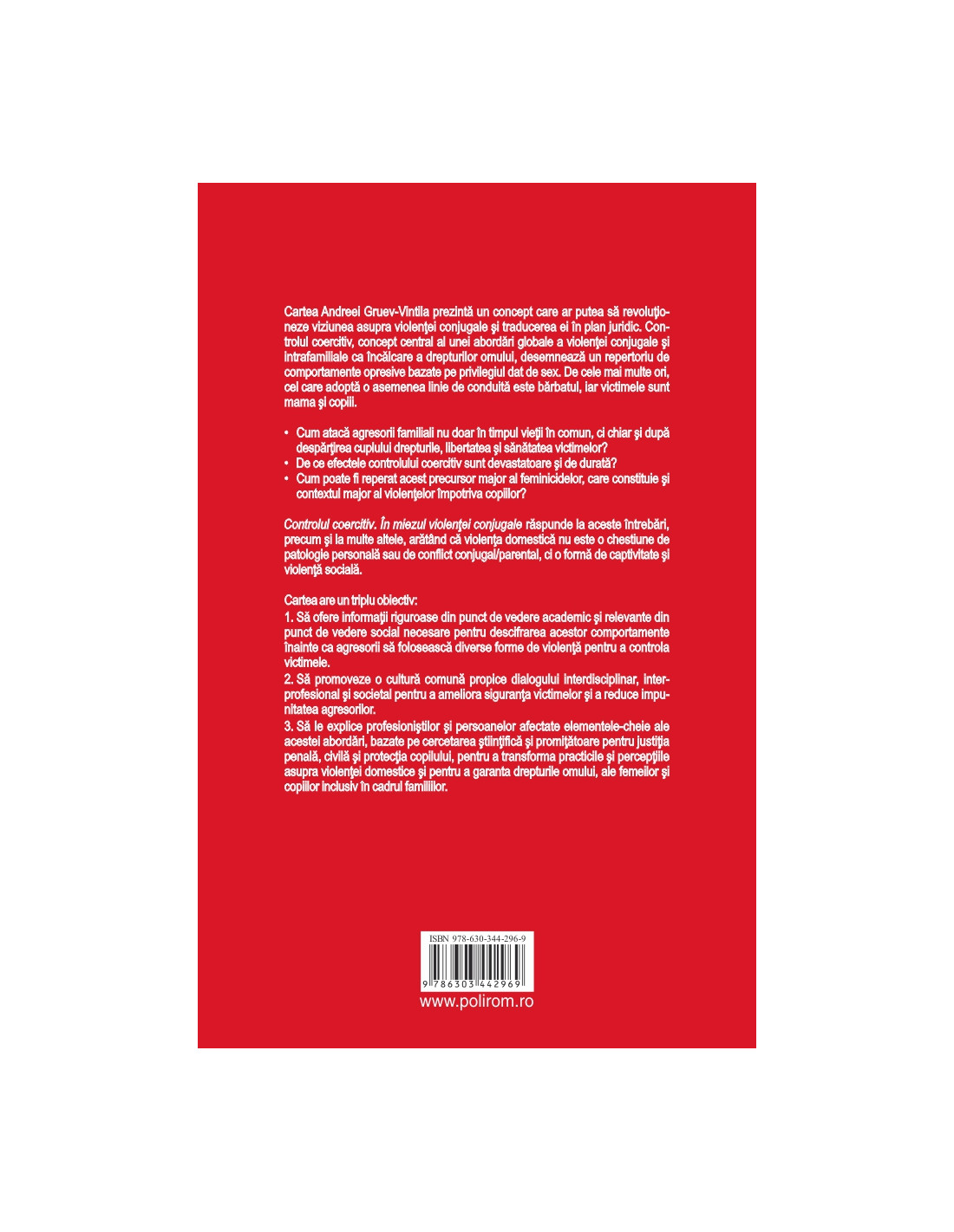 Cartea Andreei Gruev-Vintila prezintă un concept care ar putea să revoluţioneze viziunea asupra violenţei conjugale şi traducerea ei în plan juridic. Controlul coercitiv, concept central al unei abordări globale a violenţei conjugale şi intrafamiliale ca încălcare a drepturilor omului, desemnează un repertoriu de comportamente opresive bazate pe privilegiul dat de sex. De cele mai multe ori, cel care adoptă o asemenea linie de conduită este bărbatul, iar victimele sunt mama şi copiii.