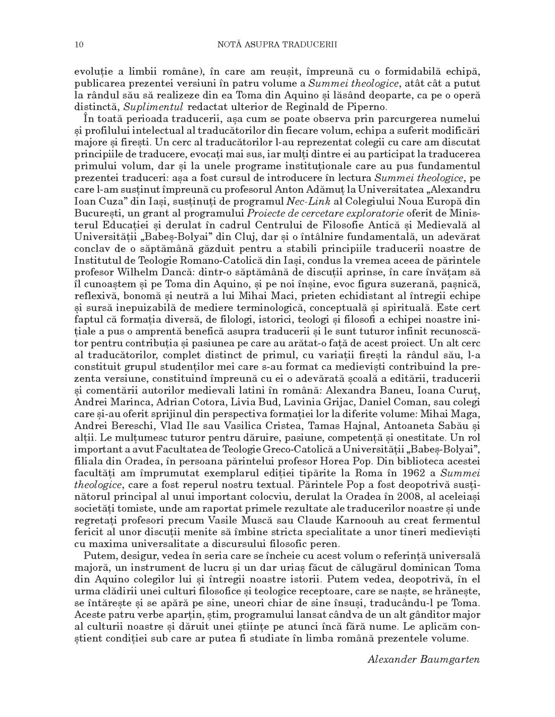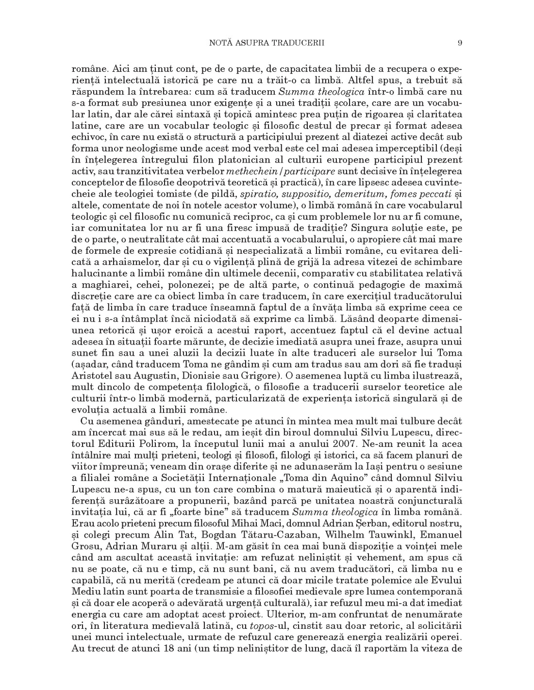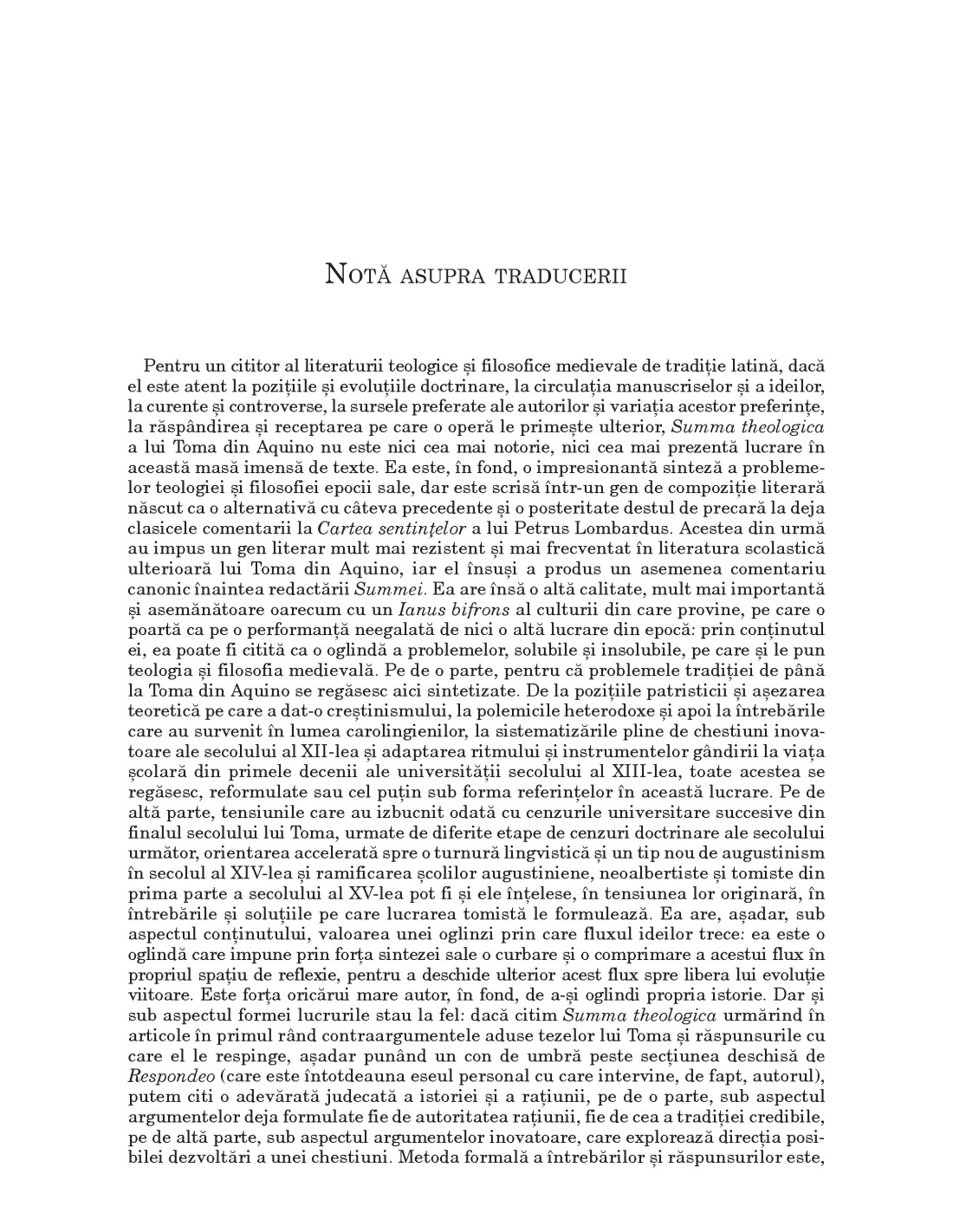 Născut la Roccasecca, în anul 1225, Toma din Aquino este una dintre figurile ilustre ale teologiei și filosofiei medievale. De-a lungul carierei intelectuale, a avut un ideal fundamental care îi guvernează întreaga operă: realizarea unui acord între tradiția iudeo-creștină și viziunea greco-arabă despre lume. Astfel, el a valorificat în teologia creștină filosofia lui Aristotel și Averroes, gîndirea neoplatoniciană din opera lui Plotin, Proclos sau din lucrarea anonimă Cartea despre cauze, îmbinînd, fericit sau tensionat, tezele acestora cu fundamentele tradiției creștine, de la Dionisie Areopagitul la Augustin sau de la omiliile lui Ioan Gură-de-Aur la teologia sistematică a lui Ioan Damaschin. În opera lui Toma din Aquino pot fi contemplate două aspecte diferite: pe de o parte, armonia unor sistematice construcții de idei, care, în esență, exprimă viziunea omului medieval despre lume; pe de alta, tensiunile pe care codul genetic al gîndirii occidentale le poartă în sine și cu asumarea cărora debutează modernitatea. Condamnat, în 1277, la trei ani după moartea sa, de oficialitățile ecleziastice pentru 63 de teze din Summa theologica, reabilitat ulterior și, în fine, sanctificat în 1324, Toma din Aquino este un autor care trebuie redescoperit tocmai în circumstanțele polemicilor medievale care l-au determinat să scrie, ca figură marcată de coliziunea celor două lumi, a filosofiei grecești și a monoteismului iudeo-creștin, care se luptau în conștiința sa intelectuală.