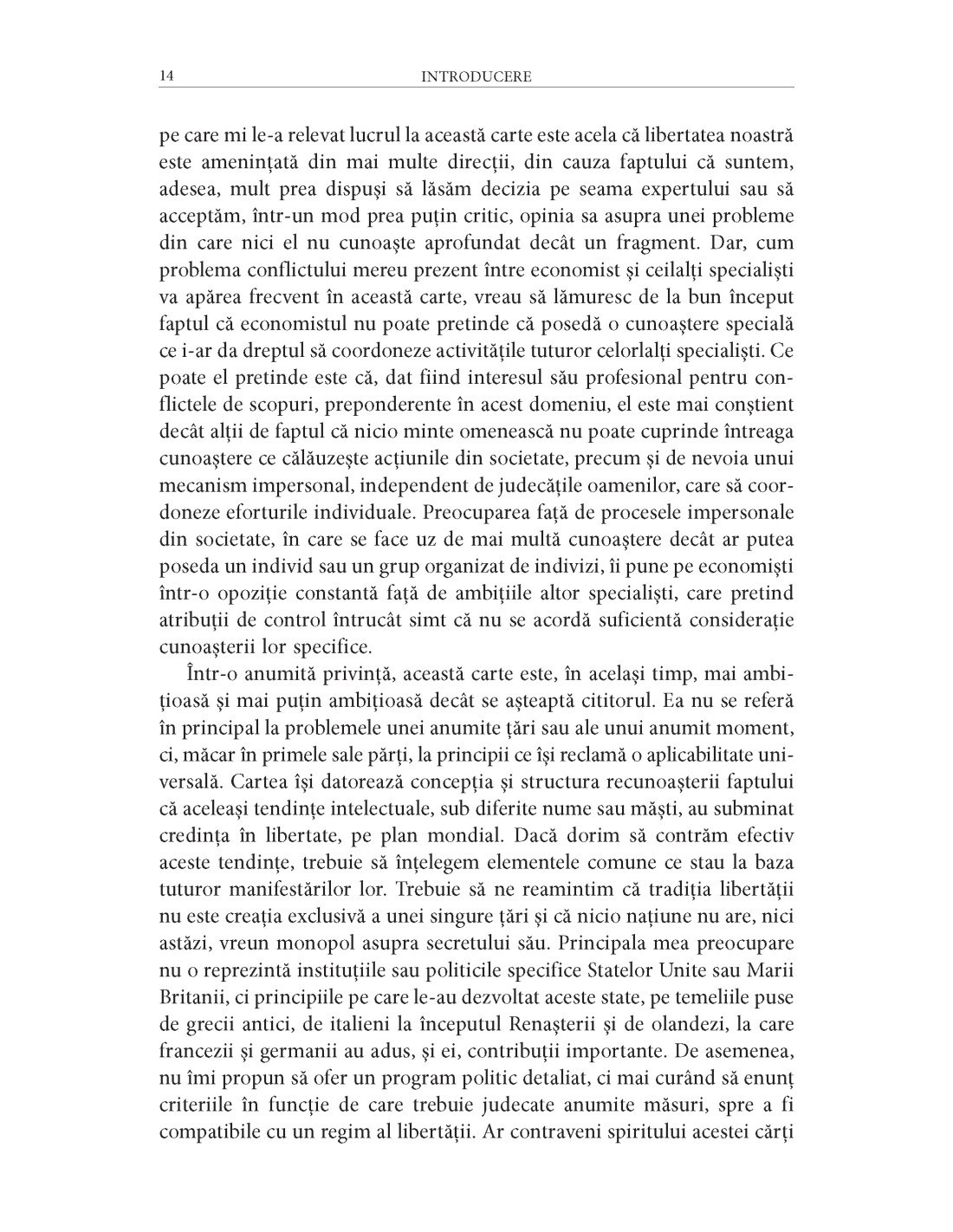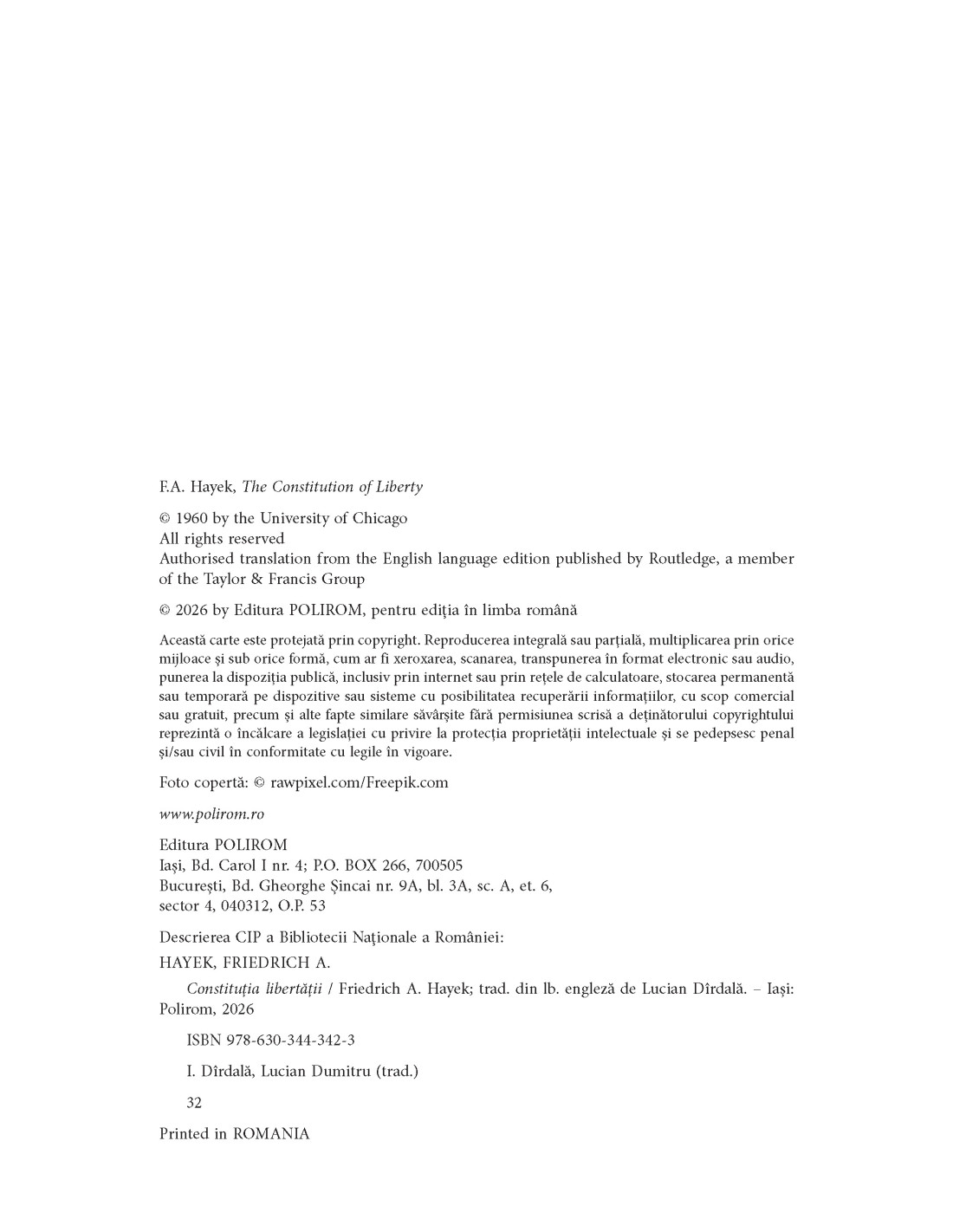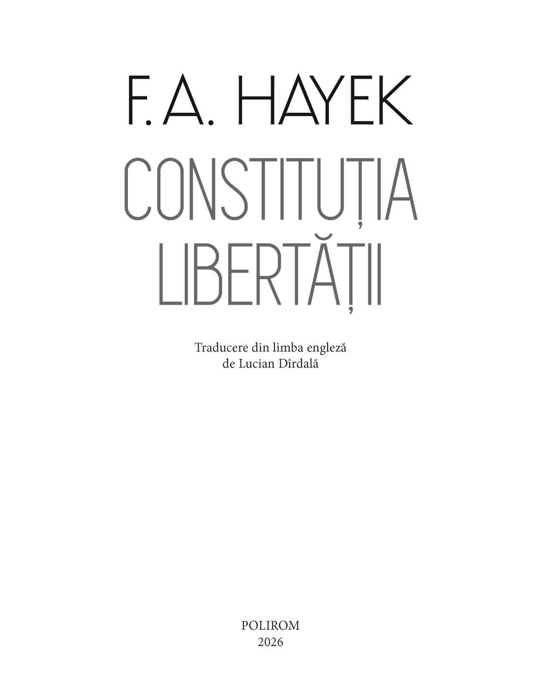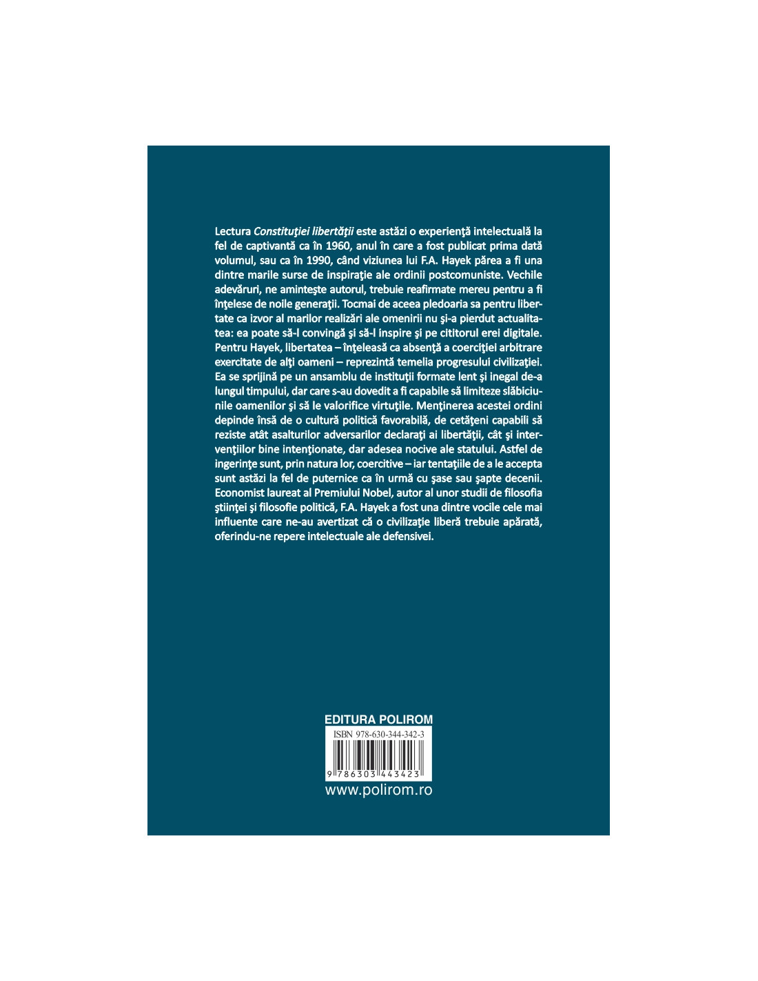 Lectura Constituţiei libertăţii este astăzi o experienţă intelectuală la fel de captivantă ca în 1960, anul în care a fost publicat prima dată volumul, sau ca în 1990, când viziunea lui F.A. Hayek părea a fi una dintre marile surse de inspiraţie ale ordinii postcomuniste. Vechile adevăruri, ne aminteşte autorul, trebuie reafirmate mereu pentru a fi înţelese de noile generaţii. Tocmai de aceea pledoaria sa pentru libertate ca izvor al marilor realizări ale omenirii nu şi-a pierdut actualitatea: ea poate să-l convingă şi să-l inspire şi pe cititorul erei digitale. Pentru Hayek, libertatea – înţeleasă ca absenţă a coerciţiei arbitrare exercitate de alţi oameni – reprezintă temelia progresului civilizaţiei. Ea se sprijină pe un ansamblu de instituţii formate lent şi inegal de-a lungul timpului, dar care s-au dovedit a fi capabile să limiteze slăbiciunile oamenilor şi să le valorifice virtuţile. Menţinerea acestei ordini depinde însă de o cultură politică favorabilă, de cetăţeni capabili să reziste atât asalturilor adversarilor declaraţi ai libertăţii, cât şi intervenţiilor bine intenţionate, dar adesea nocive ale statului. Astfel de ingerinţe sunt, prin natura lor, coercitive – iar tentaţiile de a le accepta sunt astăzi la fel de puternice ca în urmă cu şase sau şapte decenii. Economist laureat al Premiului Nobel, autor al unor studii de filosofia ştiinţei şi filosofie politică, F.A. Hayek a fost una dintre vocile cele mai influente care ne-au avertizat că o civilizaţie liberă trebuie apărată, oferindu-ne repere intelectuale ale defensivei.