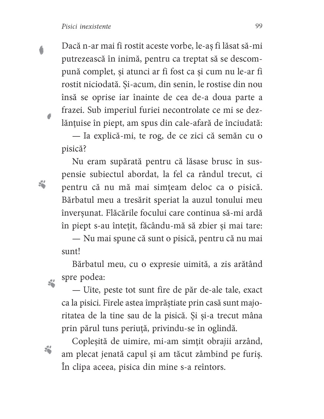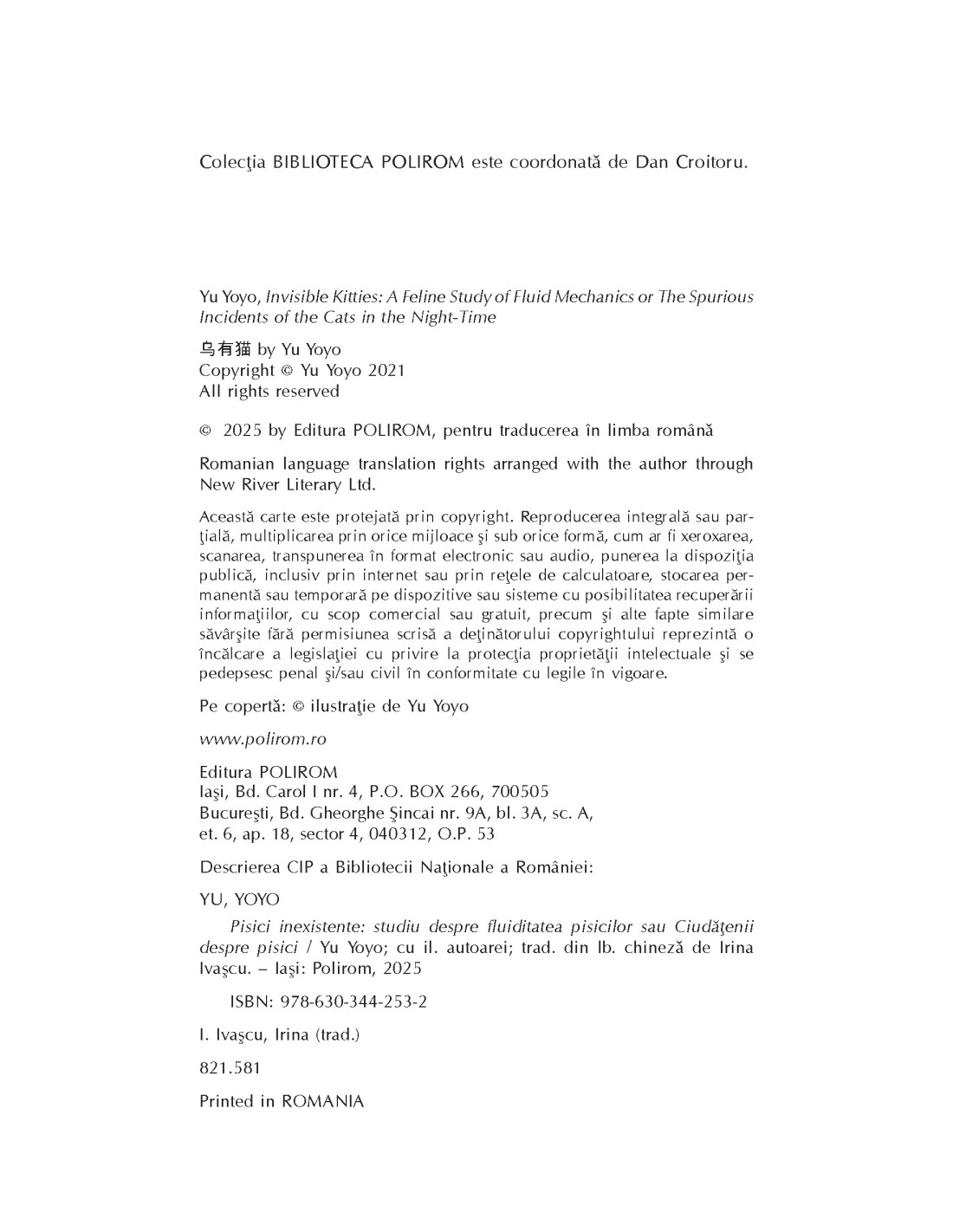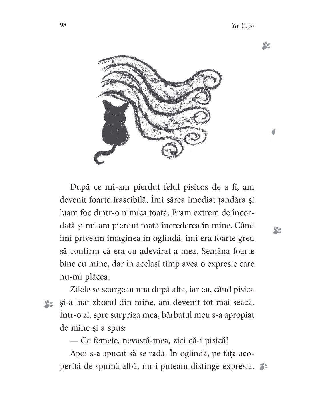 Acest roman inventiv – irezistibil pentru fanii unor cărţi precum Pisica musafir de Takashi Hiraide sau Oraşele invizibile de Italo Calvino – spune povestea unui cuplu de tineri care ajung din întâmplare stăpânii unui pisoi adorabil şi jucăuş. Cu ochi strălucitori şi coadă stufoasă, animăluţul, botezat Gogoaşă, dă peste cap viaţa din apartamentul lor înghesuit. Dar lucrurile nu se opresc aici, fiindcă o felină atrage imediat alta, oferindu-le astfel celor doi soţi ocazia de-a pătrunde în lumea fantastică a pisicilor. O meditaţie asupra felului de-a fi al felinelor şi în acelaşi timp o scrisoare de dragoste adresată acestora, romanul urmăreşte relaţia dintre cei doi tineri şi pisicile cu care locuiesc, dar şi cu cele care le populează închipuirea. Jonglând cu graniţele dintre realitate şi imaginaţie, Pisici inexistente ne face cunoştinţă cu o galerie de feline cu adevărat extraordinare, care sfidează legile fizicii şi chiar moartea, cad din cer, răsar din pământ, se schimbă întruna, zboară, plutesc sau se evaporă. Alcătuit din şaizeci de capitole scurte, scrise în stilul elegant şi sclipitor al lui Yu Yoyo şi ilustrate chiar de autoare, romanul Pisici inexistente este o celebrare a vieţii cotidiene şi a pisicilor care o fac mai savuroasă.
