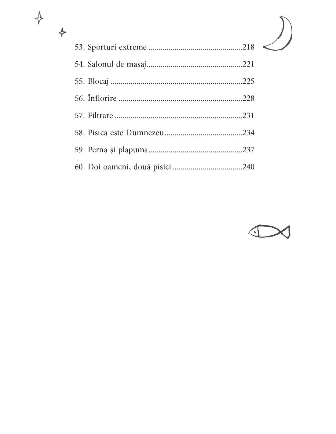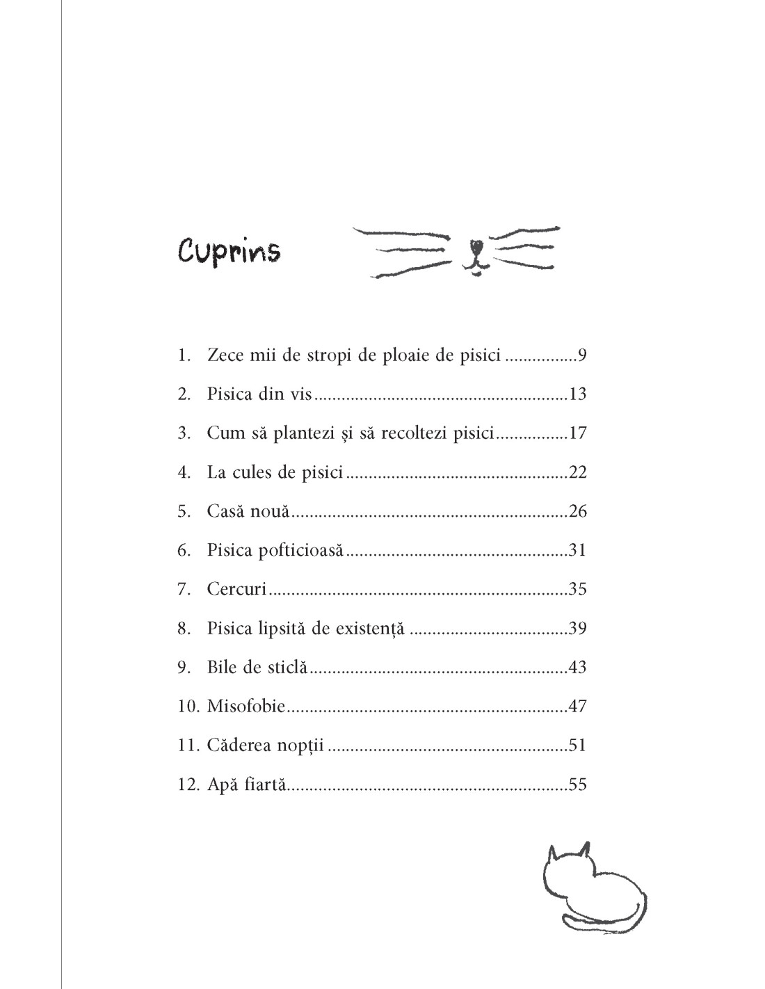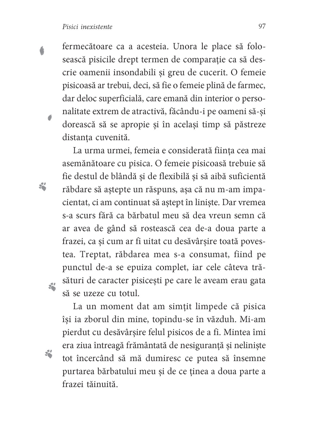 Acest roman inventiv – irezistibil pentru fanii unor cărţi precum Pisica musafir de Takashi Hiraide sau Oraşele invizibile de Italo Calvino – spune povestea unui cuplu de tineri care ajung din întâmplare stăpânii unui pisoi adorabil şi jucăuş. Cu ochi strălucitori şi coadă stufoasă, animăluţul, botezat Gogoaşă, dă peste cap viaţa din apartamentul lor înghesuit. Dar lucrurile nu se opresc aici, fiindcă o felină atrage imediat alta, oferindu-le astfel celor doi soţi ocazia de-a pătrunde în lumea fantastică a pisicilor. O meditaţie asupra felului de-a fi al felinelor şi în acelaşi timp o scrisoare de dragoste adresată acestora, romanul urmăreşte relaţia dintre cei doi tineri şi pisicile cu care locuiesc, dar şi cu cele care le populează închipuirea. Jonglând cu graniţele dintre realitate şi imaginaţie, Pisici inexistente ne face cunoştinţă cu o galerie de feline cu adevărat extraordinare, care sfidează legile fizicii şi chiar moartea, cad din cer, răsar din pământ, se schimbă întruna, zboară, plutesc sau se evaporă. Alcătuit din şaizeci de capitole scurte, scrise în stilul elegant şi sclipitor al lui Yu Yoyo şi ilustrate chiar de autoare, romanul Pisici inexistente este o celebrare a vieţii cotidiene şi a pisicilor care o fac mai savuroasă.
