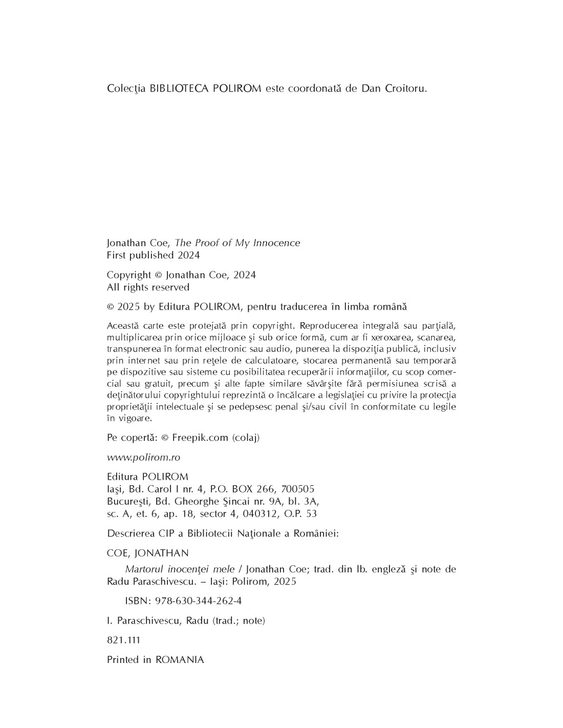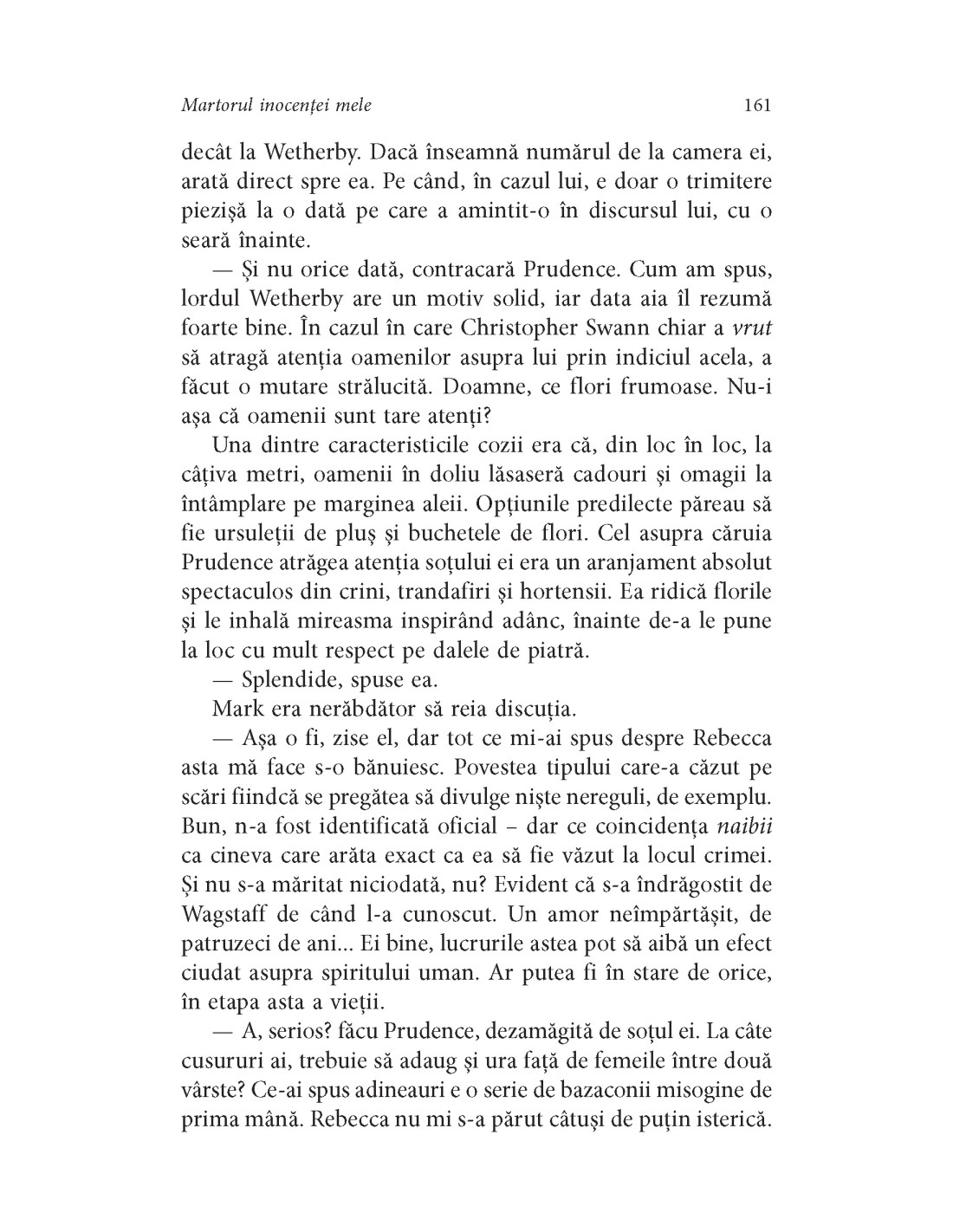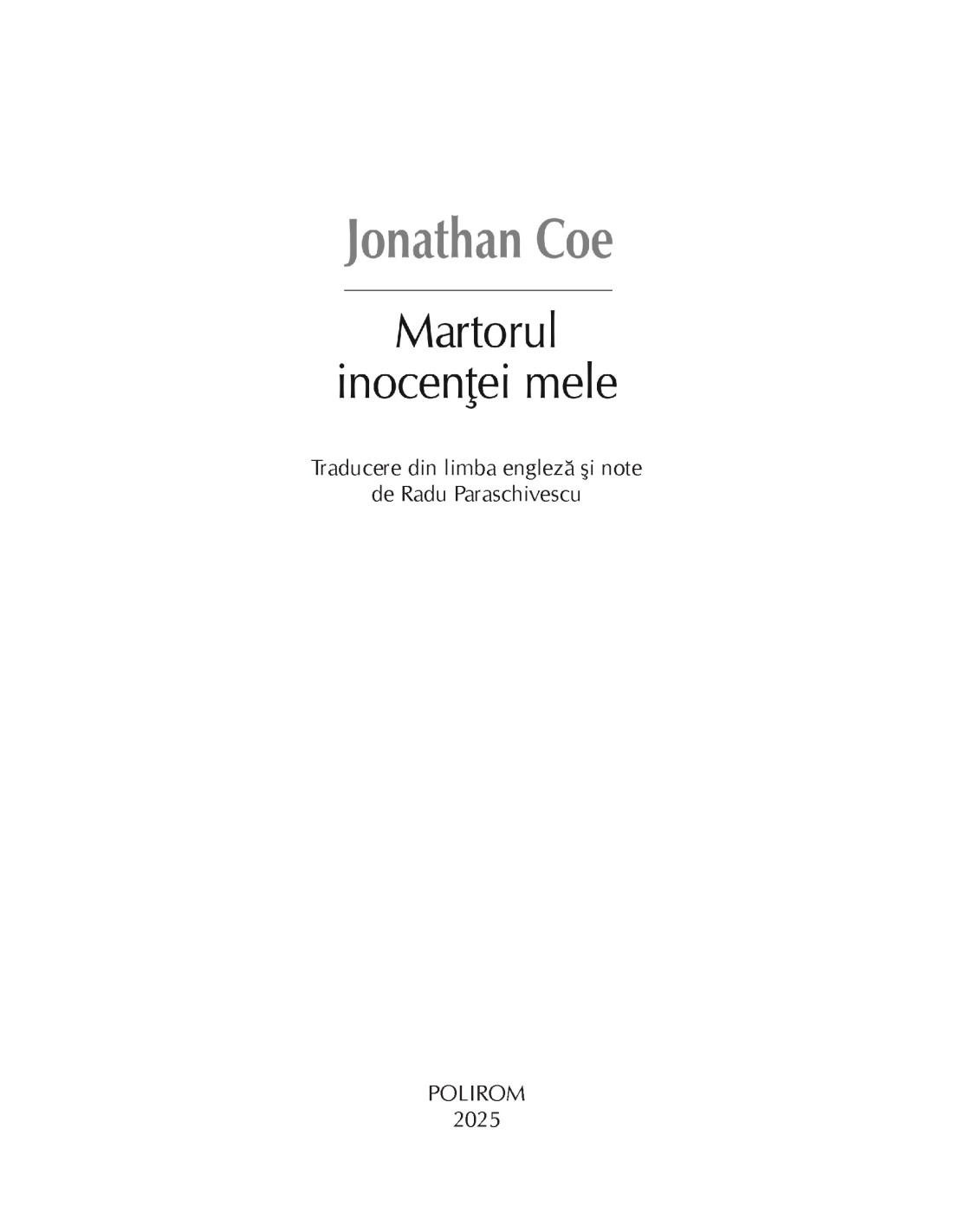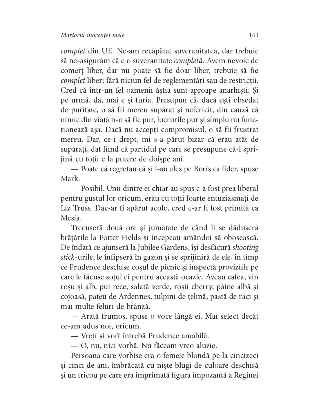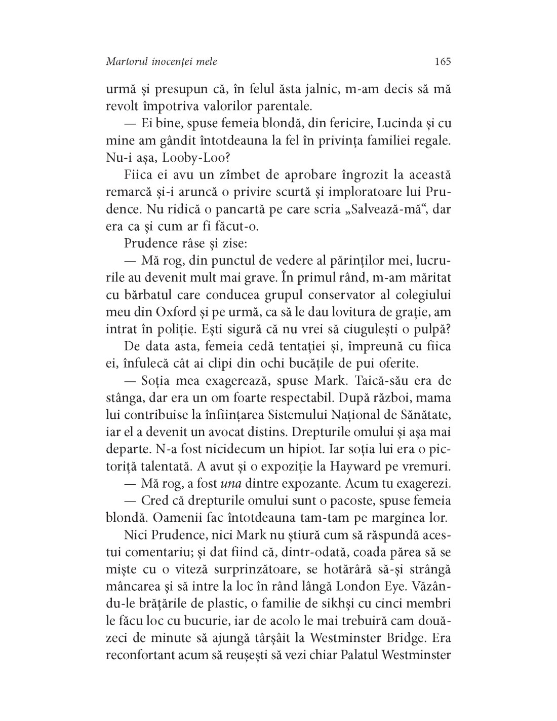 „Dacă vrei să înţelegi prezentul şi să speri că vei aştepta liniştit viitorul, e nevoie să pătrunzi în cotloanele umbroase ale trecutului. Cam asta fac şi personajele din Martorul inocenţei mele, în încercarea de-a da sens unei lumi ieşite din ţâţâni. Freamătul politic şi policier-ul de factură britanică îşi dau mâna în acest roman surprinzător, care izbuteşte în egală măsură să amuze şi să neliniştească.” (Radu Paraschivescu)