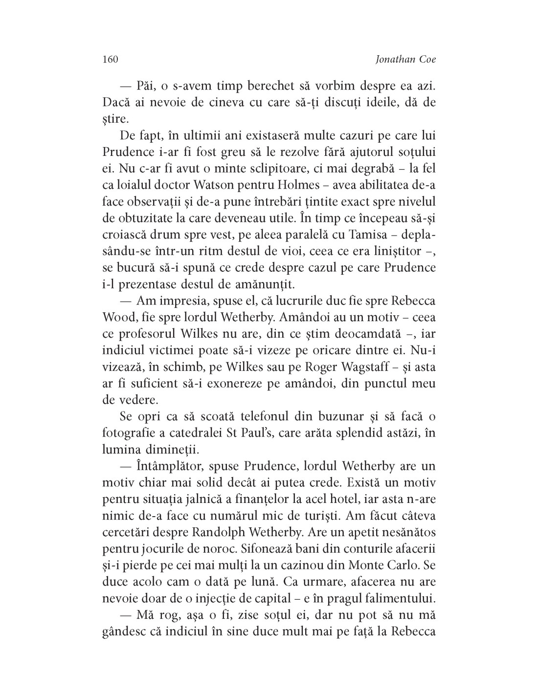 Jonathan COE (născut în 1961, la Birmingham) a studiat la Trinity College, Cambridge. A fost profesor la University of Warwick, unde a obţinut şi titlul de doctor în literatură engleză. Primele sale romane – Femeia întâmplătoare (1987), Un strop de dragoste (1989) şi Piticii morţii (1990; Polirom, 2006) – îl impun ca o nouă voce a literaturii britanice contemporane, caracterizată printr-un umor specific, prin preocuparea pentru problemele sociale şi printr-o accentuată tonalitate sarcastică, temperată de un umanism subtil. Romanul Ce hăcuială! (1994; Polirom, 2008, 2023) obţine John Llewellyn Rhys Prize în Anglia şi Prix du Meilleur Livre Étranger în Franţa, iar Casa somnului (1997; Polirom, 2001, 2015), considerat capodopera sa, este recompensat cu Writers’ Guild of Great Britain Award şi Prix Médicis Étranger. Ulterior, autorului britanic i se decernează Bollinger Everyman Wodehouse Prize pentru romanul Clubul putregaiurilor (2001; Polirom, 2004, 2012). La Editura Polirom au mai apărut romanele Cercul închis (2006, 2022), Ploaia înainte să cadă (2009, 2022), Înspăimântătoarea viaţă personală a lui Maxwell Sim (2011), Expo ’58 (2014), Numărul 11 sau Mărturii despre nebunie (2019), Middle England (2021), Domnul Wilder şi cu mine (2022, 2024) şi cartea pentru copii Oglinda dorinţelor (2020). Multe dintre romanele sale au fost adaptate pentru marele ecran.