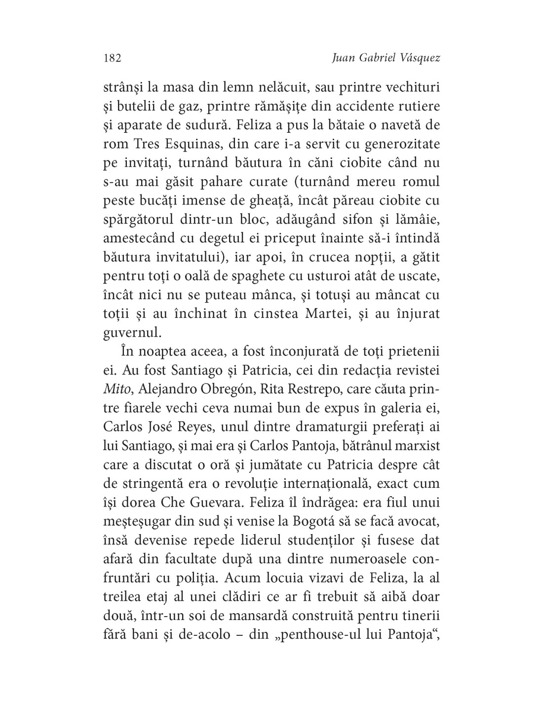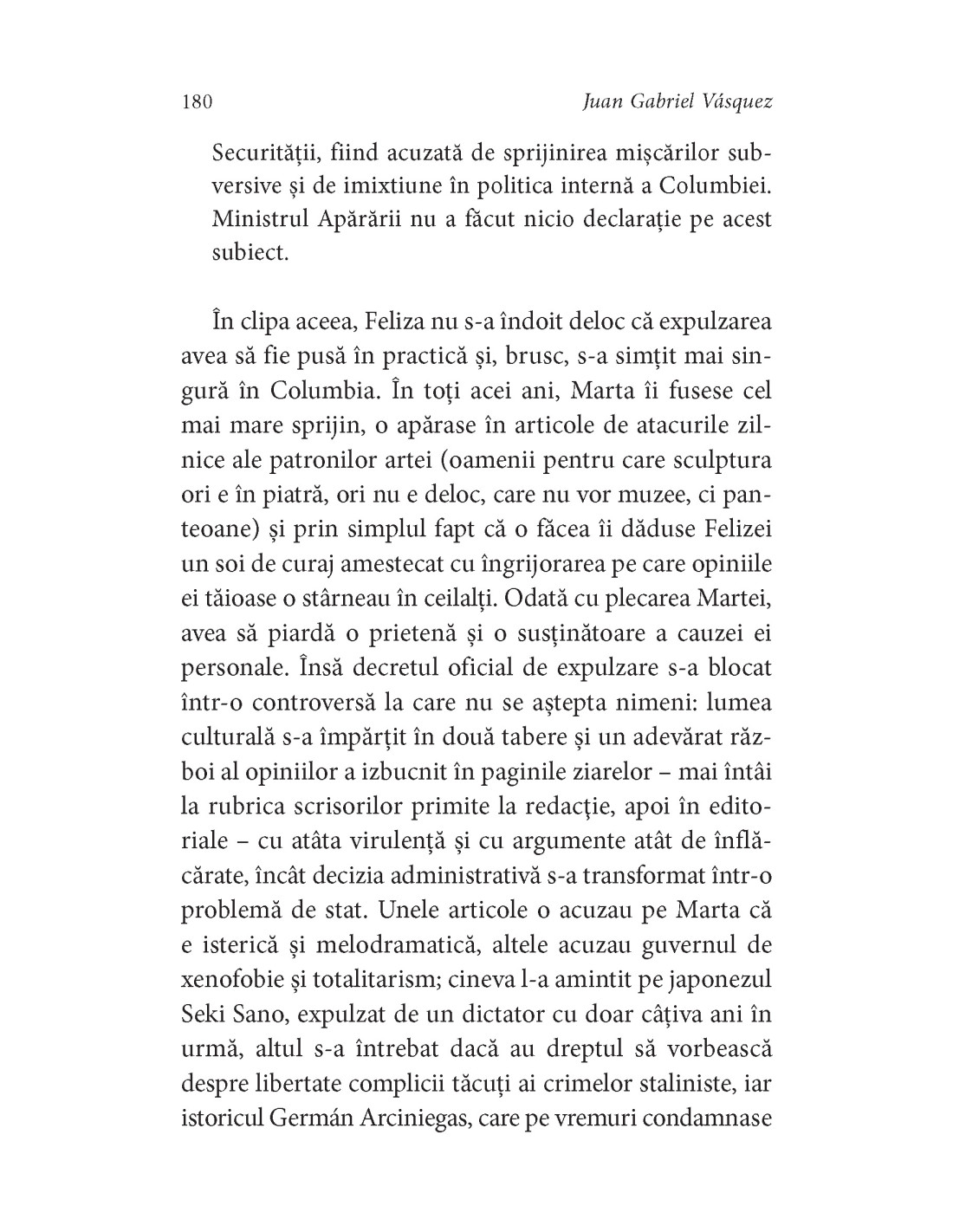 Ianuarie 1982. Sculptoriţa columbiană Feliza Bursztyn moare într-un restaurant din Paris. Avea patruzeci şi opt de ani. Era în compania soţului ei şi a patru prieteni. Unul dintre ei, scriitorul Gabriel García Márquez, a scris ulterior un articol în care constata simplu, dar plin de mister: „a murit de tristeţe”. În roman, Juan Gabriel Vásquez pleacă de la aceste cuvinte în încercarea de a investiga viaţa secretă ori necunoscută a unei femei extraordinare. Feliza Bursztyn a provocat permanent, prin viaţa şi opera sa, atât societatea columbiană, cât şi scena artistică internaţională. Fiica a doi expatriaţi evrei din Columbia, artistă revoluţionară al cărei spirit critic şi rebel a fost considerat adesea un pericol de către regimul politic al vremii, viaţa Felizei Bursztyn a ilustrat tensiunile secolului XX şi, mai presus de toate, năzuinţa femeilor de a-şi putea controla propria existenţă.