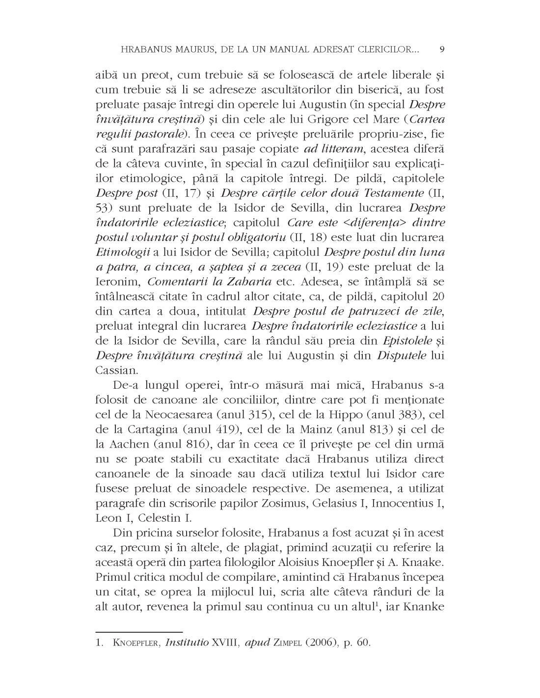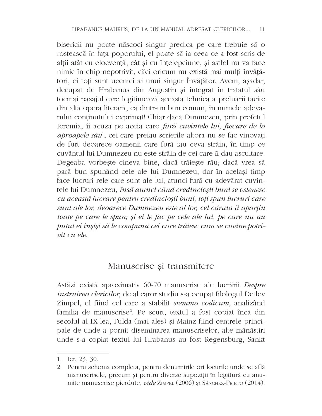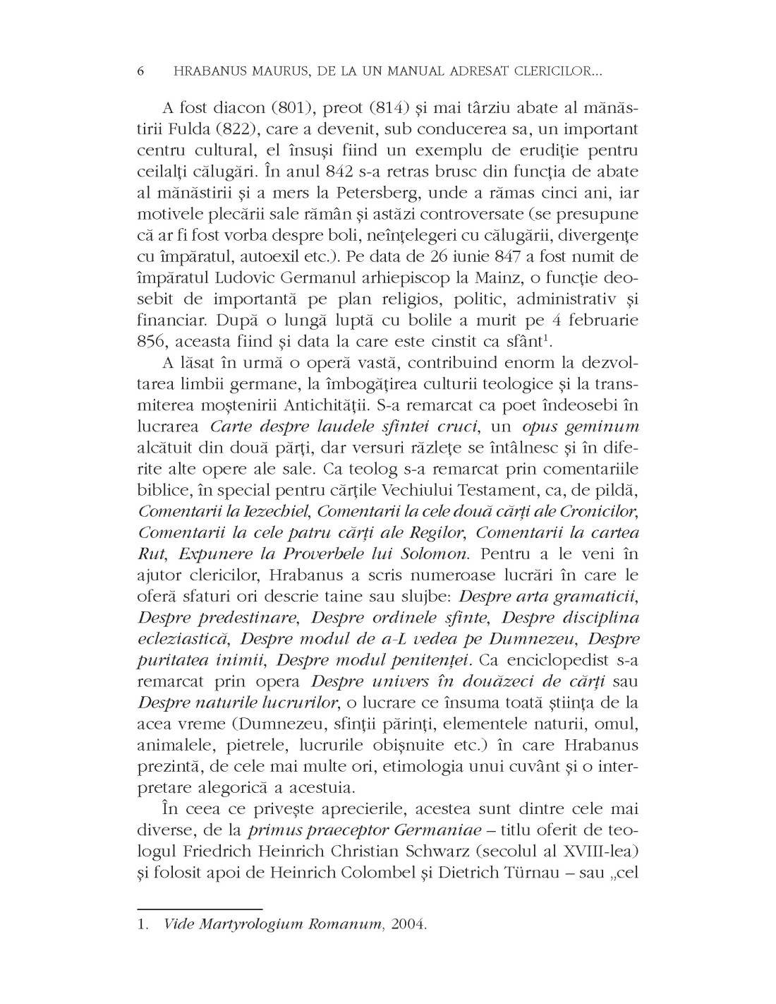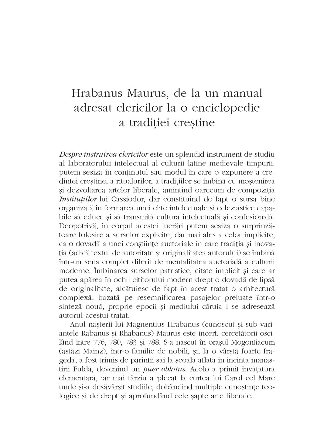 Hrabanus Maurus, arhiepiscop de Mainz în secolul al IX-lea, este unul dintre cei mai însemnați autori latini ai culturii carolingiene, în a cărui operă găsim un tratat despre educație, Despre instruirea clericilor, care poate fi pus alături de cele mai importante texte dedicate temei educației în Evul Mediu latin, de la Cassiodor, cu Instituțiile sale, și până la Hugo de Saint-Victor, cu Didascalicon. Găsim în acest tratat un rezumat al dogmaticii creștine pus în practica educativă adresată clericilor, precum și o judecată asupra celor șapte arte liberale și un mic îndrumar moral, care, împreună, au surse în Grigore cel Mare, Ieronim și Augustin. Ochiul atent al medievistului poate descoperi o structură țesută de autorități și o concepție originală despre auctorialitate, care îl fac pe Hrabanus Maurus un scriitor singular, prestigios, original, una dintre adevăratele surse timpurii ale culturii latine occidentale.