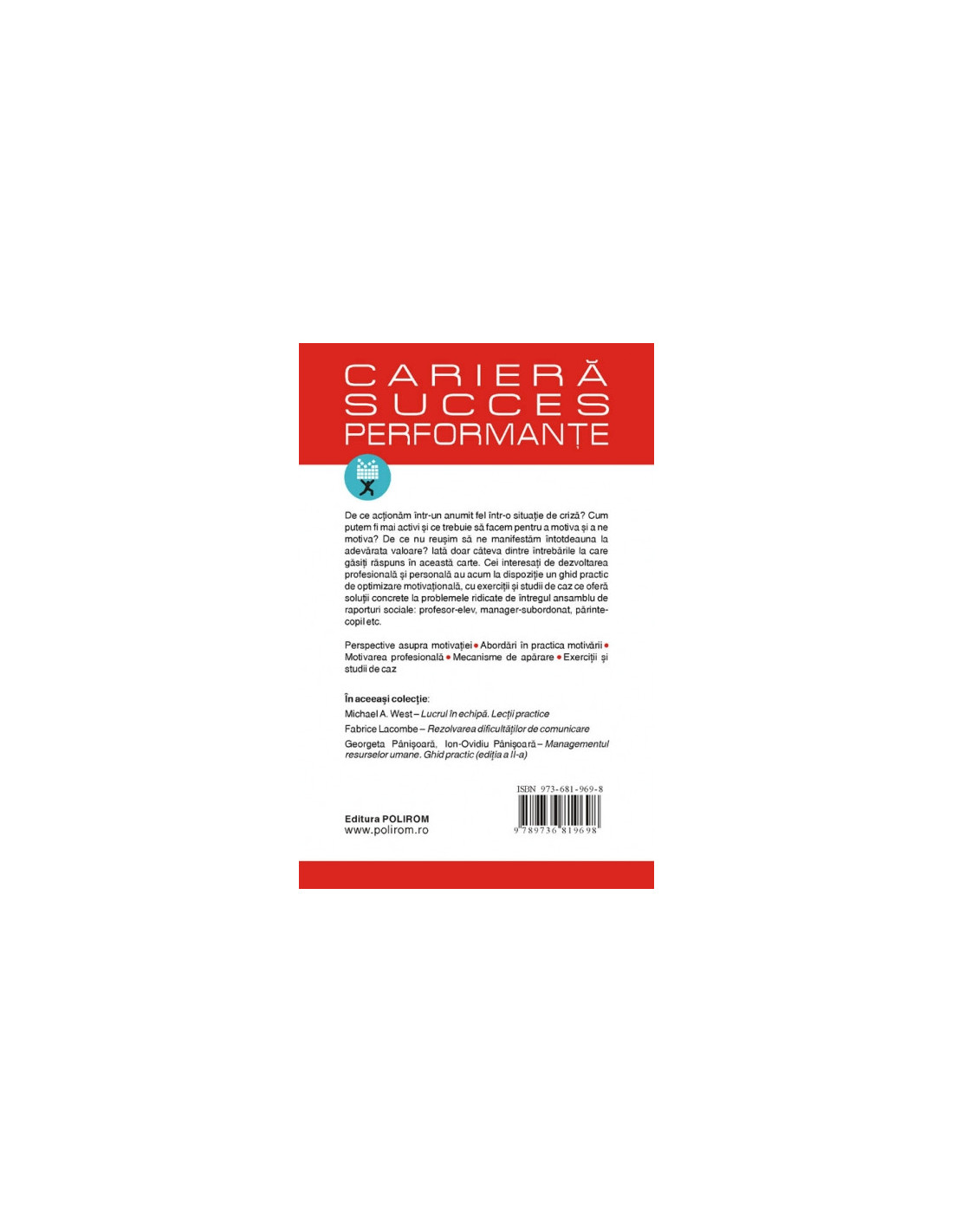 De ce actionam intr-un anumit fel intr-o situatie? Cum putem fi mai activi si ce trebuie sa facem pentru a motiva si a ne motiva? De ce nu reusim sa ne manifestam intotdeauna la adevarata valoare? Iata doar citeva dintre intrebarile la care gasiti raspuns in aceasta carte. Cei interesati de dezvoltarea profesionala si personala au acum la dispozitie un ghid practic de optimizare motivationala, cu exercitii si studii de caz ce ofera solutii concrete la problemele ridicate de intregul ansamblu de raporturi sociale: profesor-elev, manager-subordonat, parinte-copil etc.