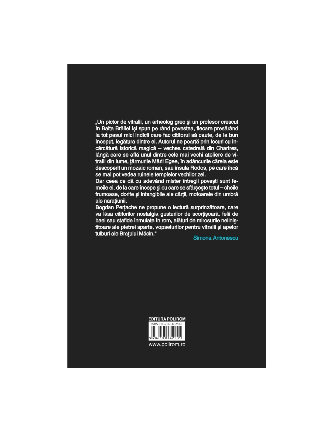 „Un pictor de vitralii, un arheolog grec și un profesor crescut în Balta Brăilei își spun pe rând povestea, fiecare presărând la tot pasul mici indicii care fac cititorul să caute, de la bun început, legătura dintre ei. Autorul ne poartă prin locuri cu încărcătură istorică magică – vechea catedrală din Chartres, lângă care se află unul dintre cele mai vechi ateliere de vitralii din lume, țărmurile Mării Egee, în adâncurile căreia este descoperit un mozaic roman, sau insula Rodos, pe care încă se mai pot vedea ruinele templelor vechilor zei.