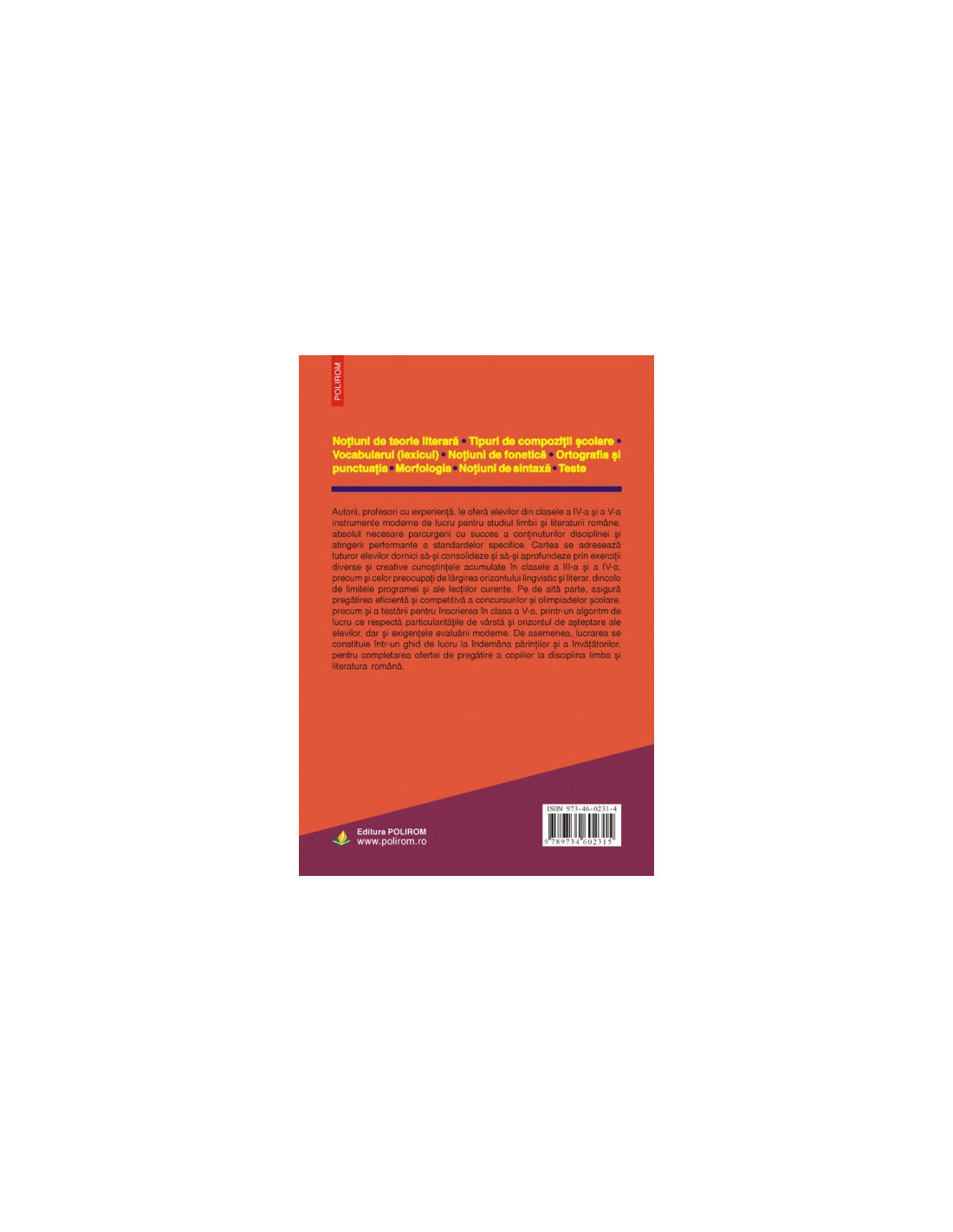 Autorii, profesori cu experienta, le ofera elevilor din clasele a IV-a si a V-a, precum si celor preocupati de largirea orizontului lingvistic si literar, instrumente de lucru pentru studiul limbii si literaturii romane, necesare consolidarii si aprofundarii prin exercitii diverse si creative a cunostintelor acumulate in clasele a III-a si a IV-a. Cartea asigura pregatirea eficienta si competitiva pentru concursuri si olimpiade scolare, precum si a testarii pentru inscrierea in clasa a V-a, printr-un algoritm de lucru ce respecta particularitatile de virsta si orizontul de asteptare ale elevilor, dar si exigentele evaluarii moderne. De asemenea, lucrarea se constituie intr-un ghid de lucru la indemina parintilor si a invatatorilor, pentru completarea ofertei de pregatire a copiilor la disciplina limba si literatura romana.