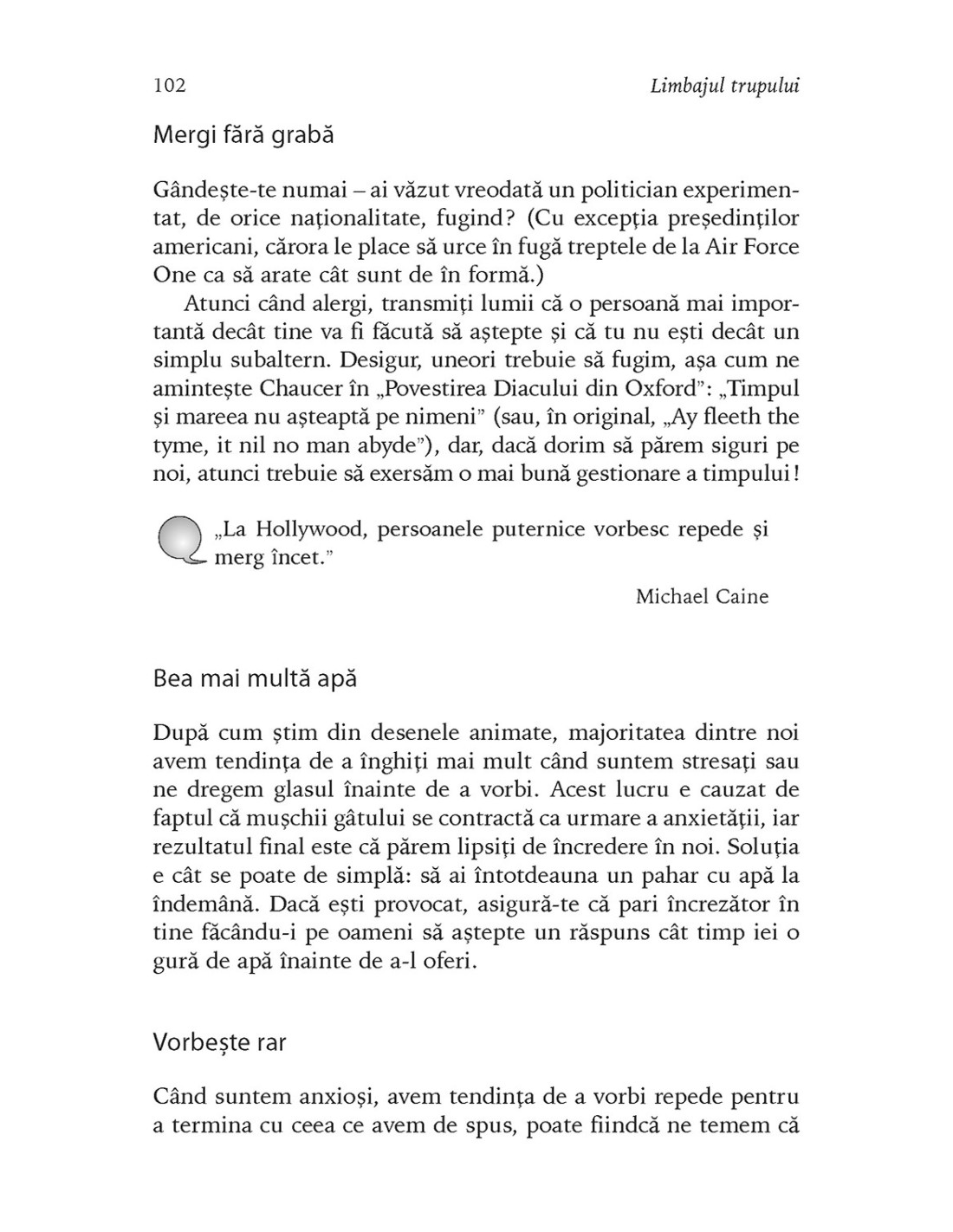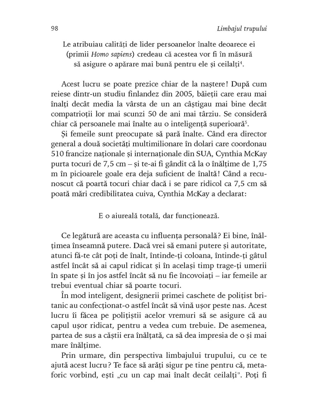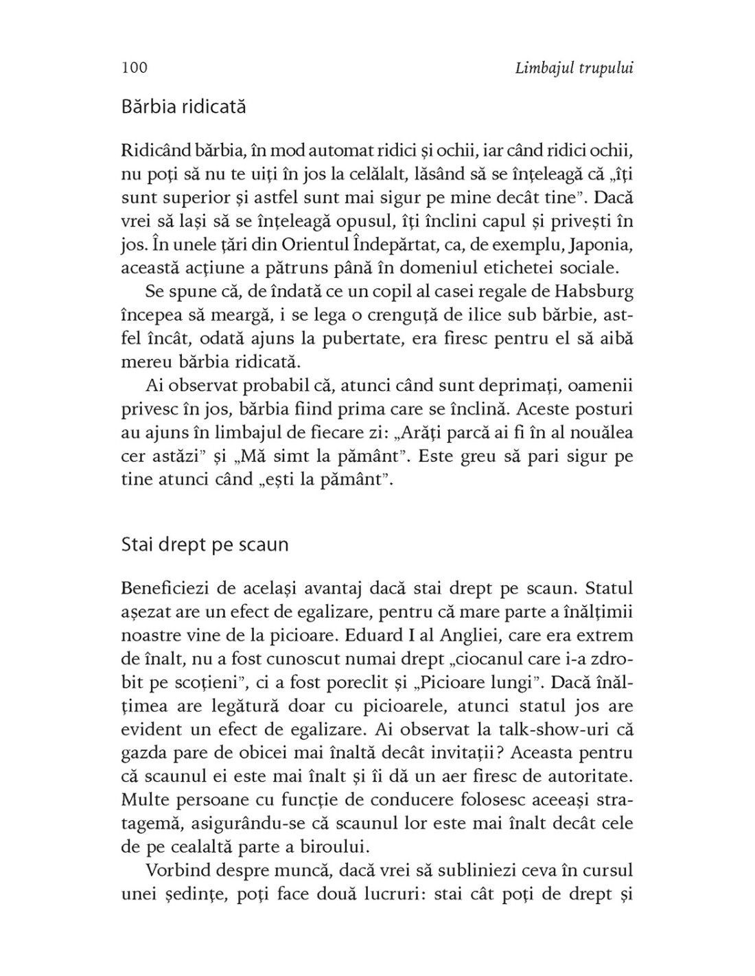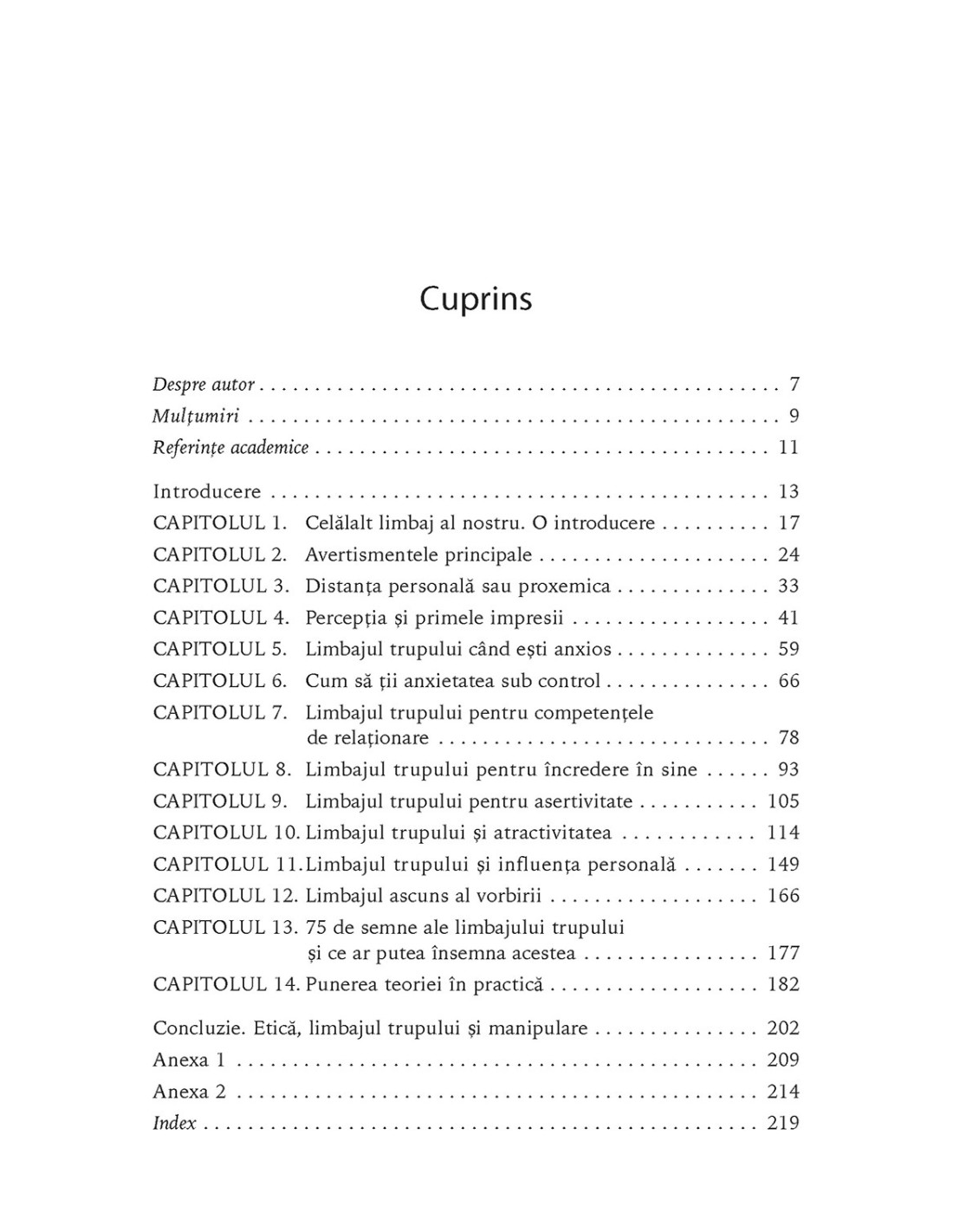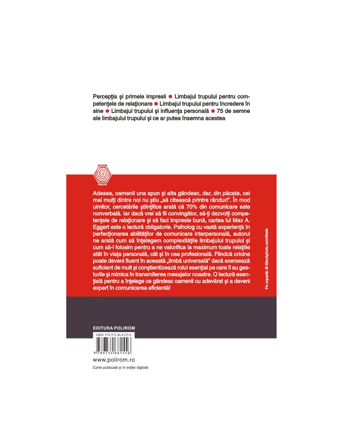 Adesea, oamenii una spun și alta gîndesc, dar, din păcate, cei mai mulți dintre noi nu știu „să citească printre rînduri”. În mod uimitor, cercetările științifice arată că 70% din comunicare este nonverbală. Iar dacă vrei să fii convingător, să-ți dezvolți competențele de relaționare și să faci impresie bună, cartea lui Max A. Eggert este o lectură obligatorie. Psiholog cu vastă experiență în perfecționarea abilităților de comunicare interpersonală, autorul ne arată cum să înțelegem complexitățile limbajului trupului și cum să-l folosim pentru a ne valorifica la maximum toate relațiile atît în viața personală, cît și în cea profesională. Fiindcă oricine poate deveni fluent în această „limbă universală” dacă exersează suficient de mult și conștientizează rolul esențial pe care îl au gesturile și mimica în transmiterea mesajelor noastre. O lectură esențială pentru a înțelege ce gîndesc oamenii cu adevărat și a deveni expert în comunicarea eficientă!