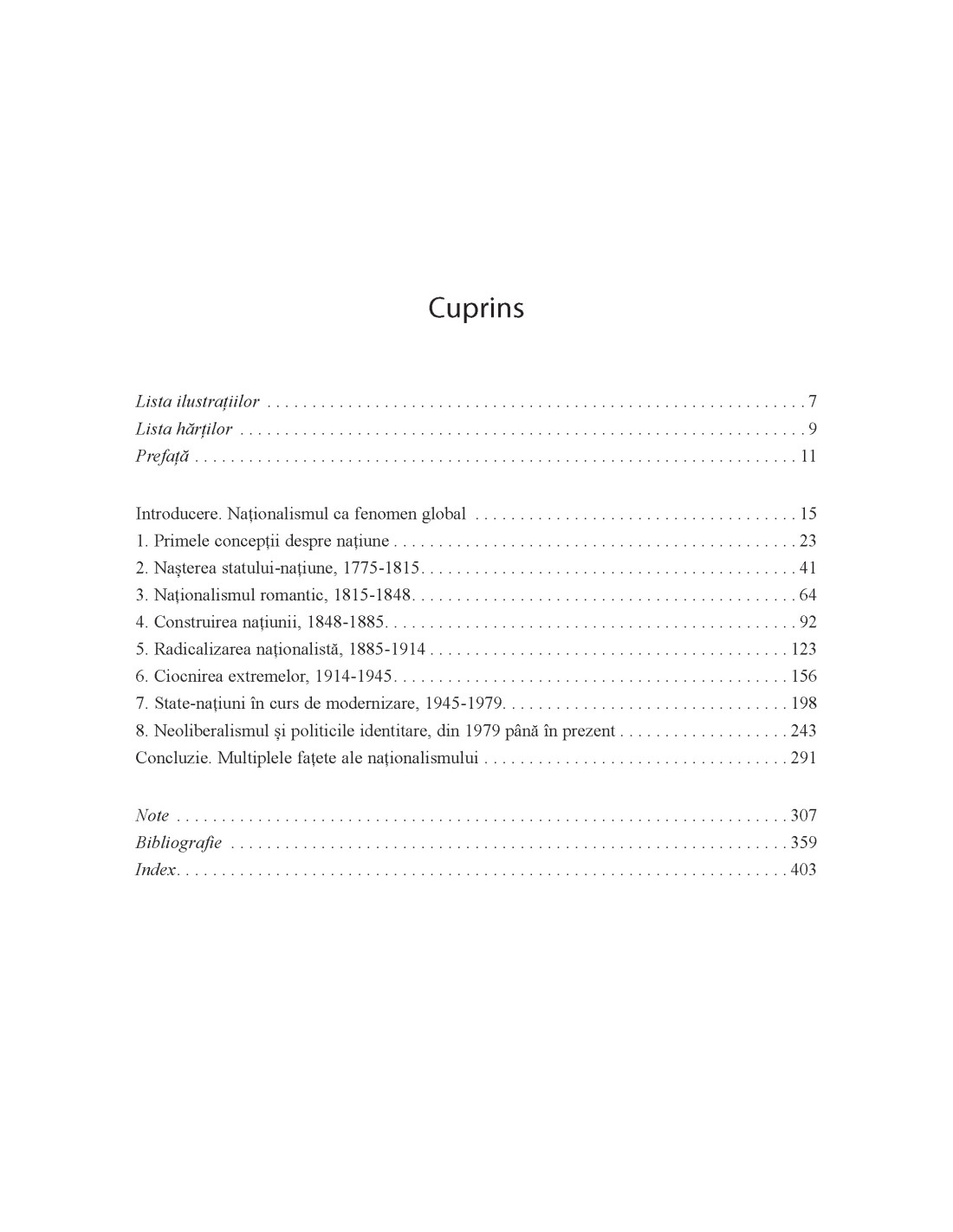 Primele concepţii despre naţiune • Naşterea statului-naţiune, 1775-1815 • Naţionalismul romantic, 1815-1848 • Construirea naţiunii, 1848-1885 • Radicalizarea naţionalistă, 1885-1914 • Ciocnirea extremelor, 1914-1945 • State-naţiuni în curs de modernizare, 1945-1979 • Neoliberalismul şi politicile identitare, din 1979 până în prezent