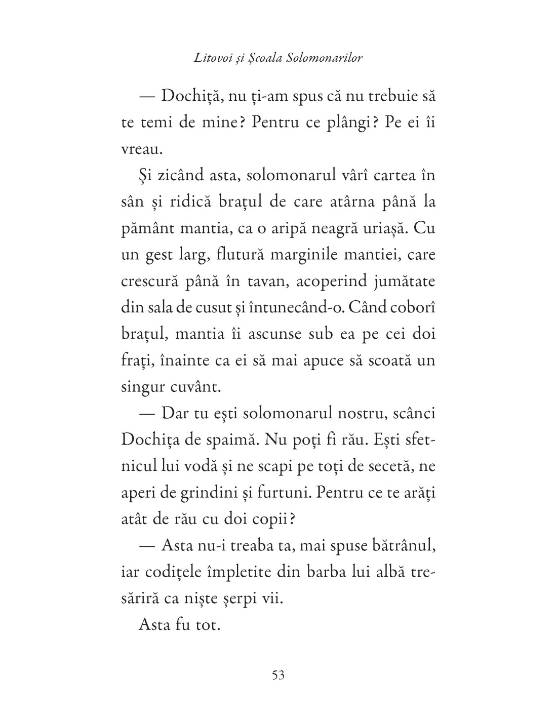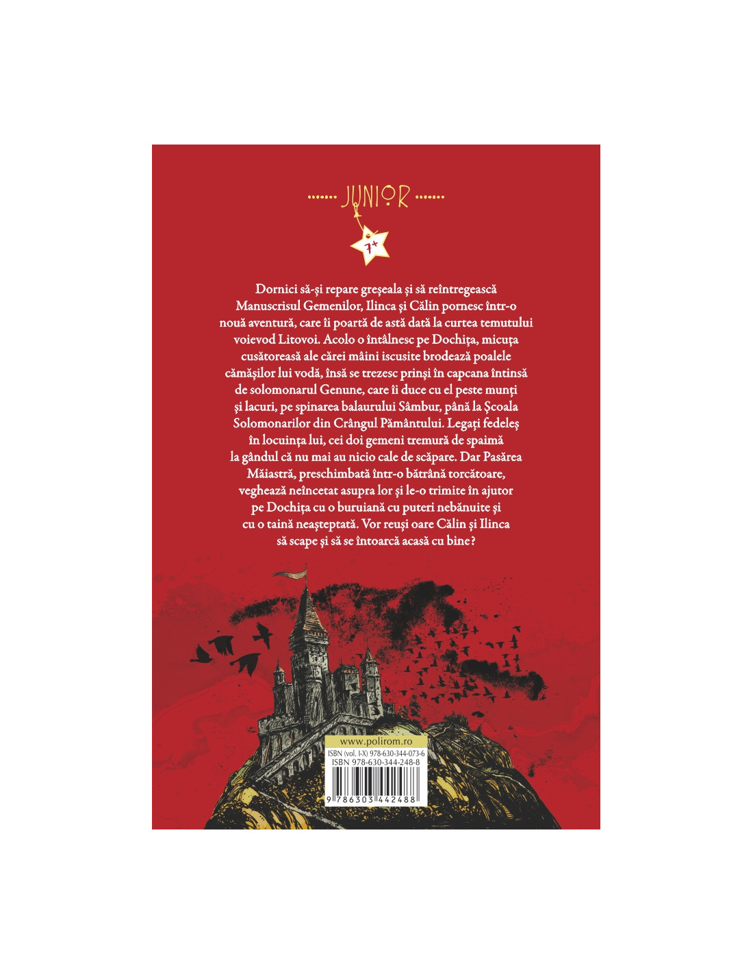 Dornici să-și repare greșeala și să reîntregească Manuscrisul Gemenilor, Ilinca și Călin pornesc într-o nouă aventură, care îi poartă de astă dată la curtea temutului voievod Litovoi. Acolo o întâlnesc pe Dochiţa, micuţa cusătoreasă ale cărei mâini iscusite brodează poalele cămășilor lui vodă, însă se trezesc prinși în capcana întinsă de solomonarul Genune, care îi duce cu el peste munţi și lacuri, pe spinarea balaurului Sâmbur, până la Școala Solomonarilor din Crângul Pământului. Legaţi fedeleș în locuinţa lui, cei doi gemeni tremură de spaimă la gândul că nu mai au nicio cale de scăpare. Dar Pasărea Măiastră, preschimbată într-o bătrână torcătoare, veghează neîncetat asupra lor și le-o trimite în ajutor pe Dochiţa cu o buruiană cu puteri nebănuite și cu o taină neașteptată. Vor reuși oare Călin și Ilinca să scape și să se întoarcă acasă cu bine?