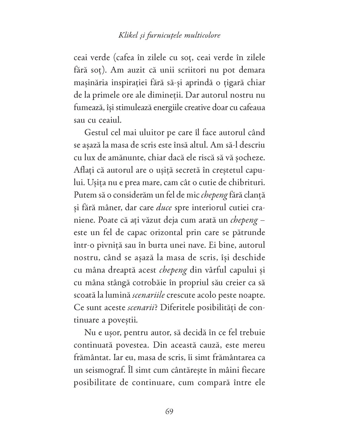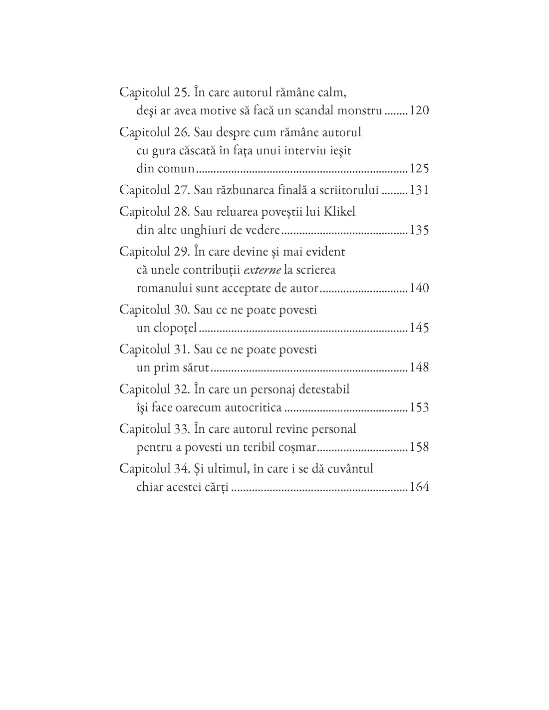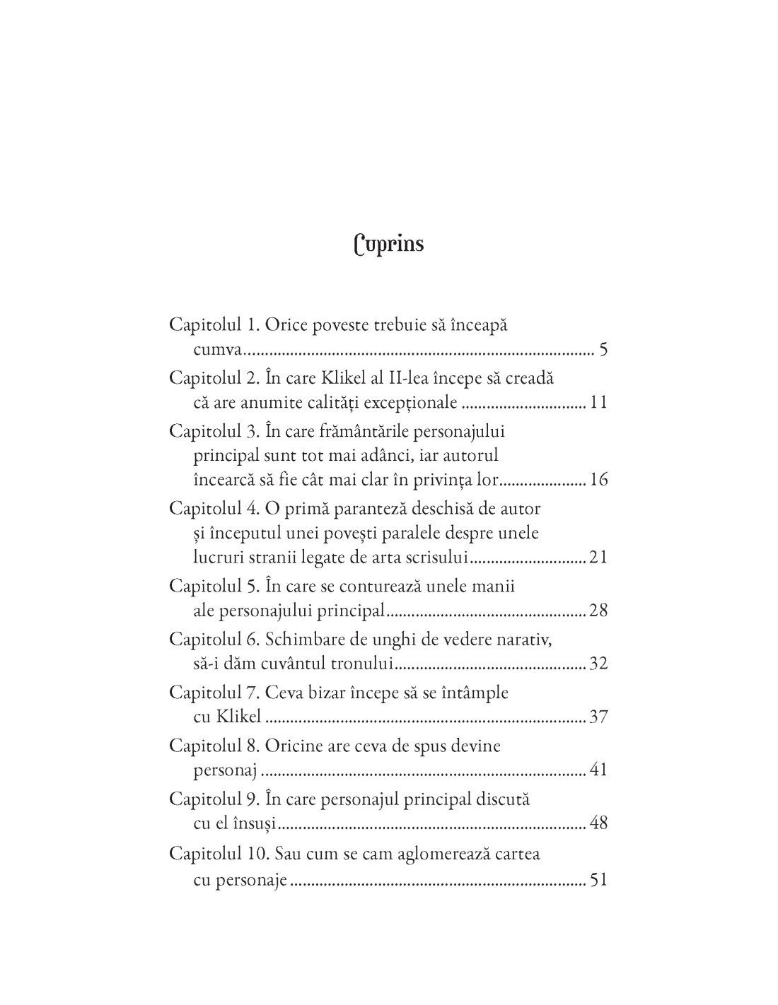 Tânărul rege Klikel al II-lea descoperă cu stupoare că, de câte ori se lasă aclamat de mulţime, pierde din înălţime un milimetru… Totul se întâmplă într-o ţară imaginară din lumea noastră reală, pe vremea când oamenii erau fascinaţi de o incredibilă invenţie: electricitatea. Povestea lui Klikel pendulează între ieri și azi, între ficţiune și realitate. Unele personaje din jurul lui își permit chiar să-l contacteze pe autor ca să-i ceară socoteală în legătură cu „rolul” lor în poveste. Aventurile lui Klikel se împletesc cu peripeţiile unui scriitor care se lasă invadat de personajele sale, uitând unde se află linia de demarcaţie dintre realitate și ficţiune, ba chiar prelungind-o dincolo de masa lui de scris…