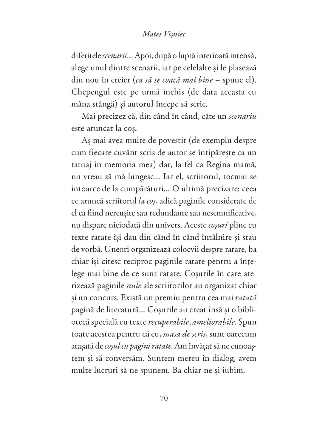 Matei VIȘNIEC s-a remarcat în anii ’80 ca poet, apoi ca dramaturg ale cărui piese, cu largă circulaţie în mediul literar, au fost interzise pe scenele profesioniste. În 1987 a părăsit România și s-a stabilit în Franţa, unde lucrează pentru Radio France Internationale. Piesele sale în limba franceză s-au bucurat de mare succes, numele lui figurând pe afișe teatrale în peste 40 de ţări. În ultimii ani, Matei Vișniec s-a remarcat și ca romancier. Dintre cărţile publicate amintim: Păianjenul în rană (teatru, 2007), Groapa din tavan (teatru, 2007), Cafeneaua Pas-Parol (roman, 2008), Sindromul de panică în Orașul Luminilor (roman, 2009, distins cu Premiul revistei Observator cultural), Negustorul de începuturi de roman (roman, 2013, distins cu Premiul „Augustin Frăţilă“, Premiul Naţional de Proză al Ziarului de Iași și Premiul liceenilor pentru cea mai îndrăgită carte a anului 2013, în cadrul Festivalului Internaţional de Literatură și Traducere, Iași), Omul de zăpadă care voia să întâlnească soarele (piesă pentru copii, 2016), Ultimele zile ale Occidentului (povestiri, 2018), Un secol de ceaţă (roman, 2021), Consulatul Lunii sau Adelina și crocodilii din mlaștină (roman pentru copii, 2025). În 2024 a primit Premiul „Gheorghe Crăciun“ pentru Opera Omnia, acordat de revista Observator cultural.