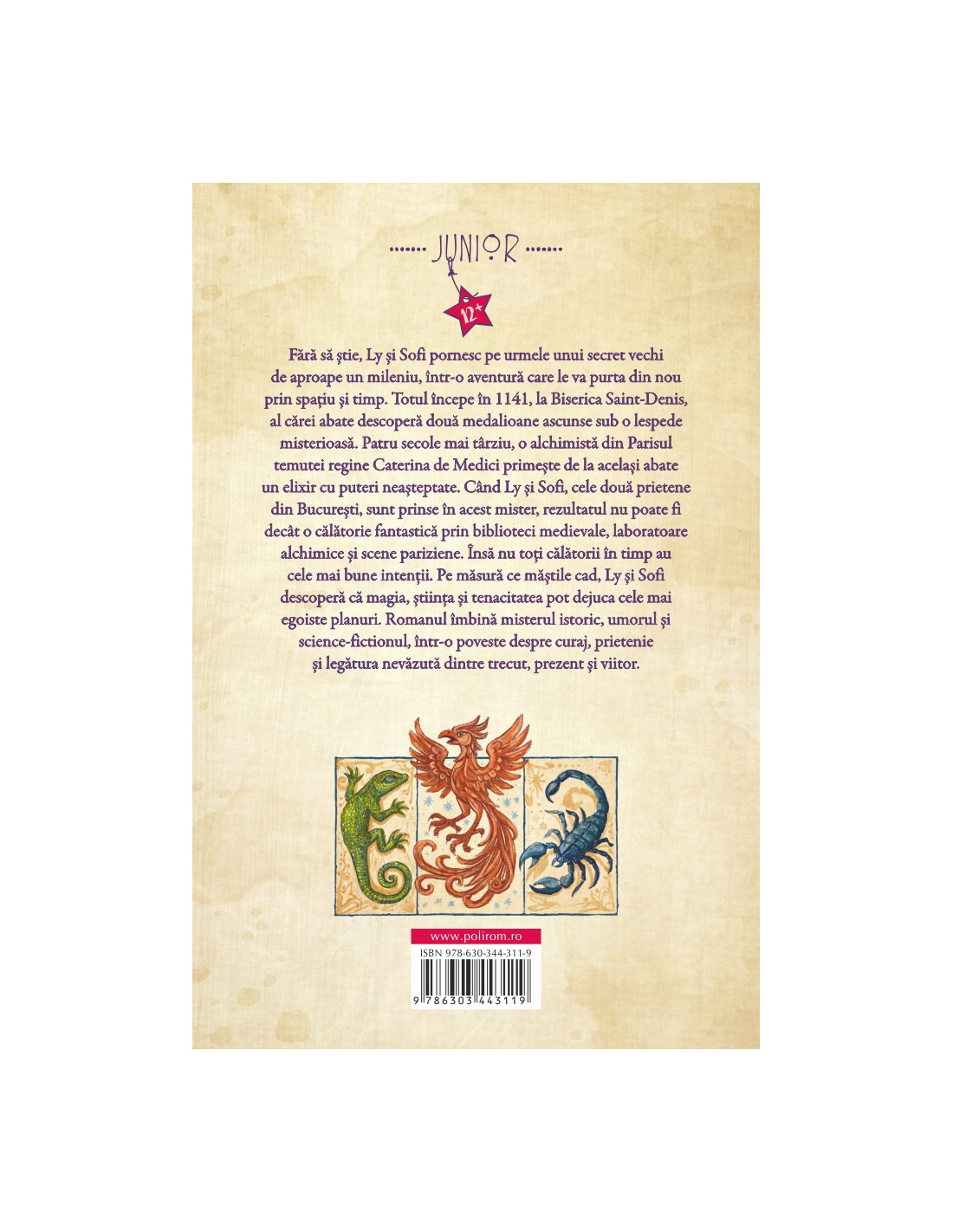 Fără să știe, Ly și Sofi pornesc pe urmele unui secret vechi de aproape un mileniu, într-o aventură care le va purta din nou prin spațiu și timp. Totul începe în 1141, la Biserica Saint-Denis, al cărei abate descoperă două medalioane ascunse sub o lespede misterioasă. Patru secole mai târziu, o alchimistă din Parisul temutei regine Caterina de Medici primește de la același abate un elixir cu puteri neașteptate. Când Ly și Sofi, cele două prietene din București, sunt prinse în acest mister, rezultatul nu poate fi decât o călătorie fantastică prin biblioteci medievale, laboratoare alchimice și scene pariziene. Însă nu toţi călătorii în timp au cele mai bune intenţii. Pe măsură ce măștile cad, Ly și Sofi descoperă că magia, știinţa și tenacitatea pot dejuca cele mai egoiste planuri. Romanul îmbină misterul istoric, umorul și science-fictionul, într-o poveste despre curaj, prietenie și legătura nevăzută dintre trecut, prezent și viitor.