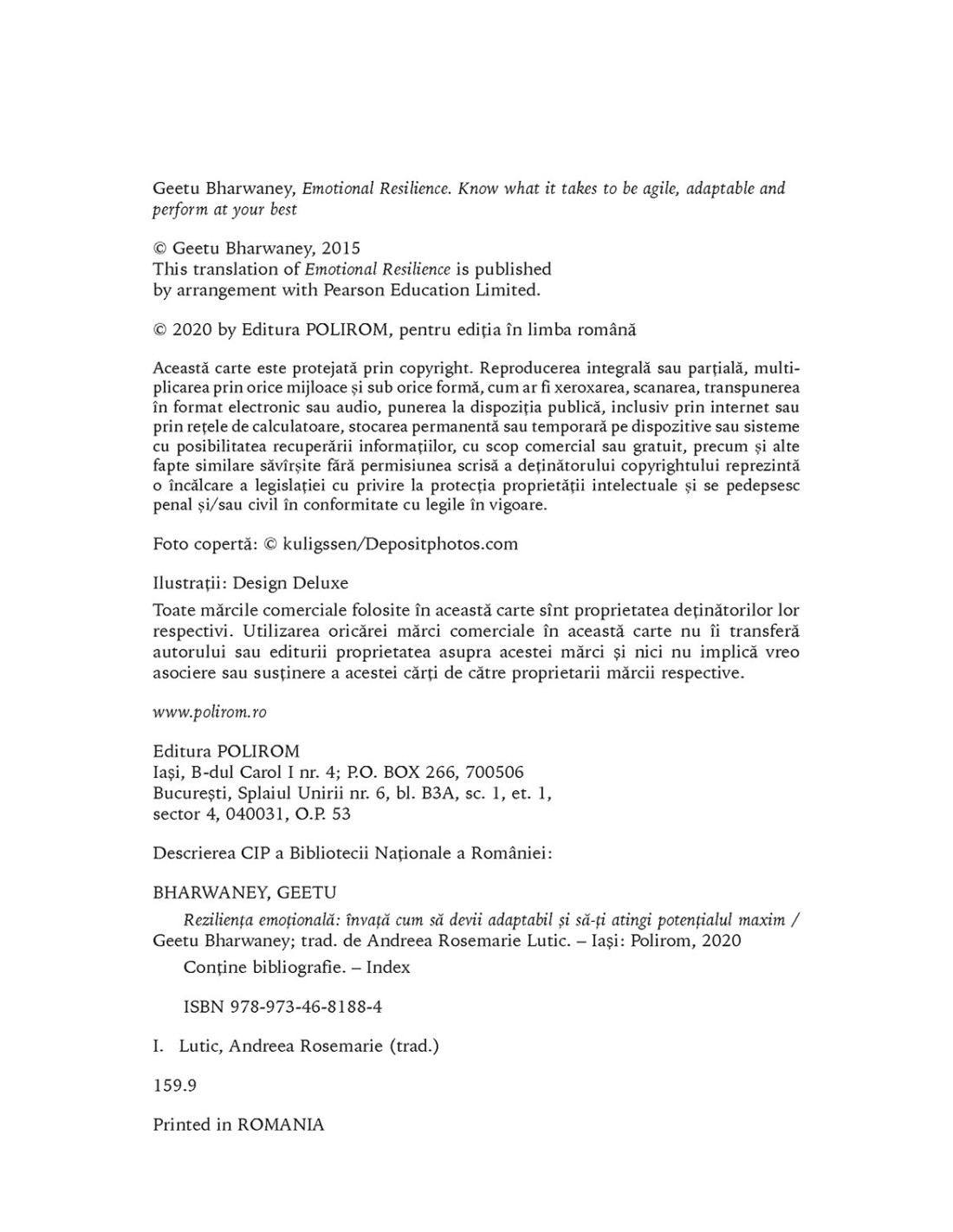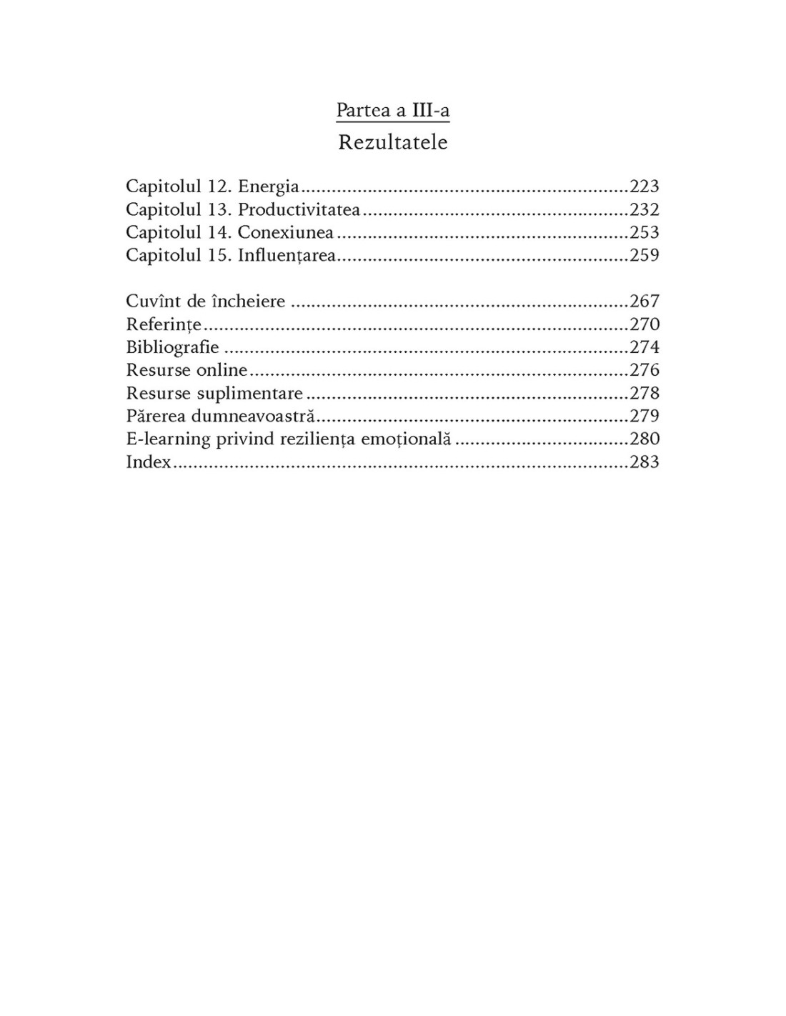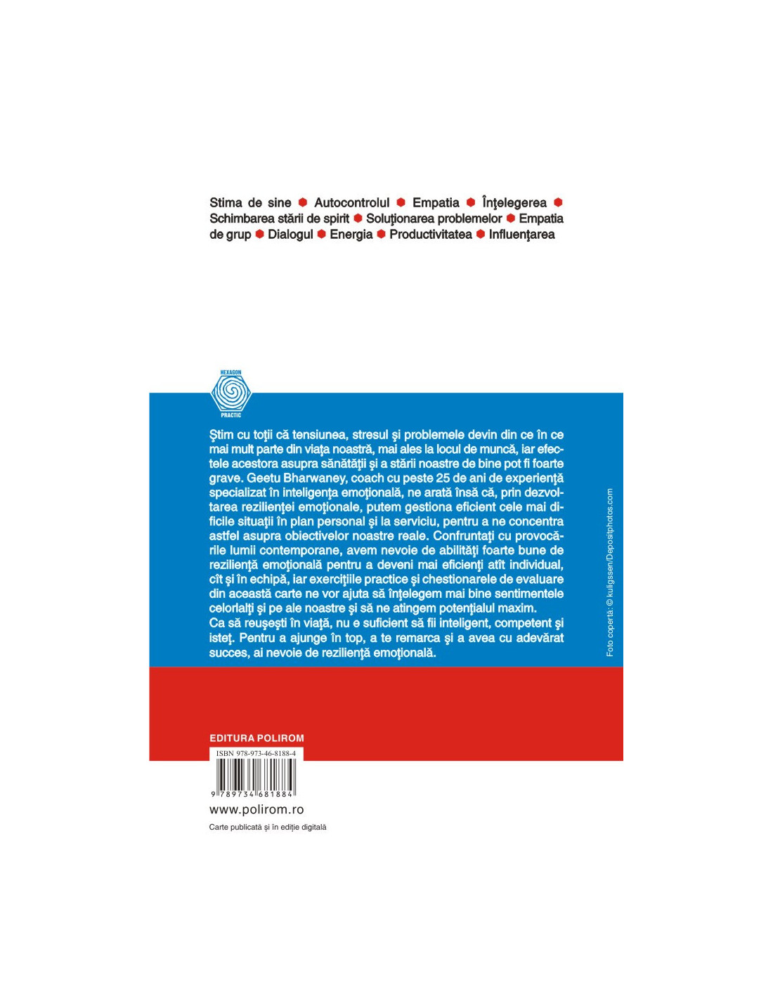 Știm cu toții că tensiunea, stresul și problemele devin din ce în ce mai mult parte din viața noastră, mai ales la locul de muncă, iar efectele acestora asupra sănătății și a stării noastre de bine pot fi foarte grave. Geetu Bharwaney, coach cu peste 25 de ani de experiență specializat în inteligența emoțională, ne arată însă că, prin dezvoltarea rezilienței emoționale, putem gestiona eficient cele mai dificile situații în plan personal și la serviciu, pentru a ne concentra astfel asupra obiectivelor noastre reale. Confruntați cu provocările lumii contemporane, avem nevoie de abilități foarte bune de reziliență emoțională pentru a deveni mai eficienți atît individual, cît și în echipă, iar exercițiile practice și chestionarele de evaluare din această carte ne vor ajuta să înțelegem mai bine sentimentele celorlalți și pe ale noastre și să ne atingem potențialul maxim. Ca să reușești în viață, nu e suficient să fii inteligent, competent și isteț. Pentru a ajunge în top, a te remarca și a avea cu adevărat succes, ai nevoie de reziliență emoțională.