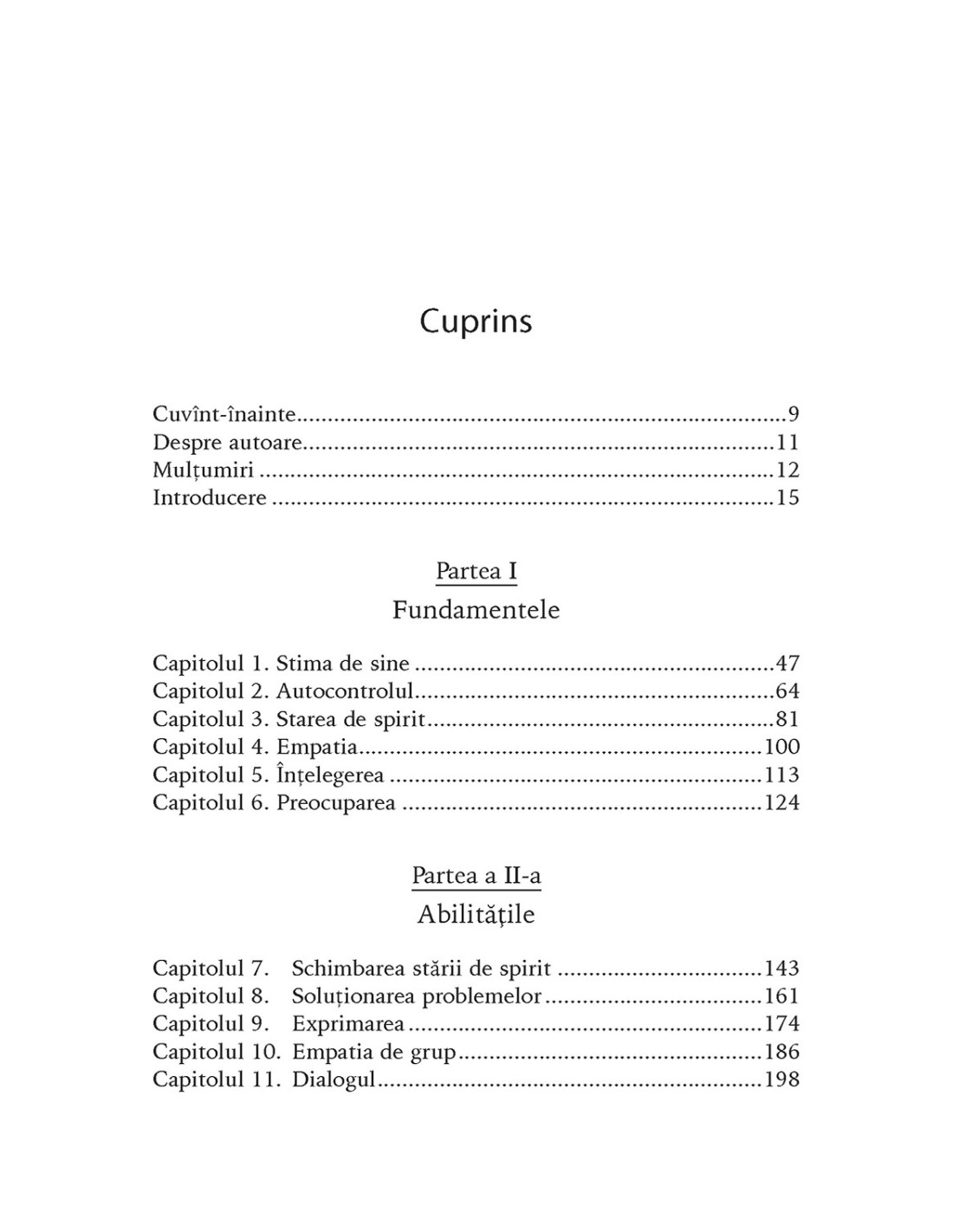 Stima de sine • Autocontrolul • Empatia • Înțelegerea • Schimbarea stării de spirit • Soluționarea problemelor • Empatia de grup • Dialogul • Energia • Productivitatea • Influențarea