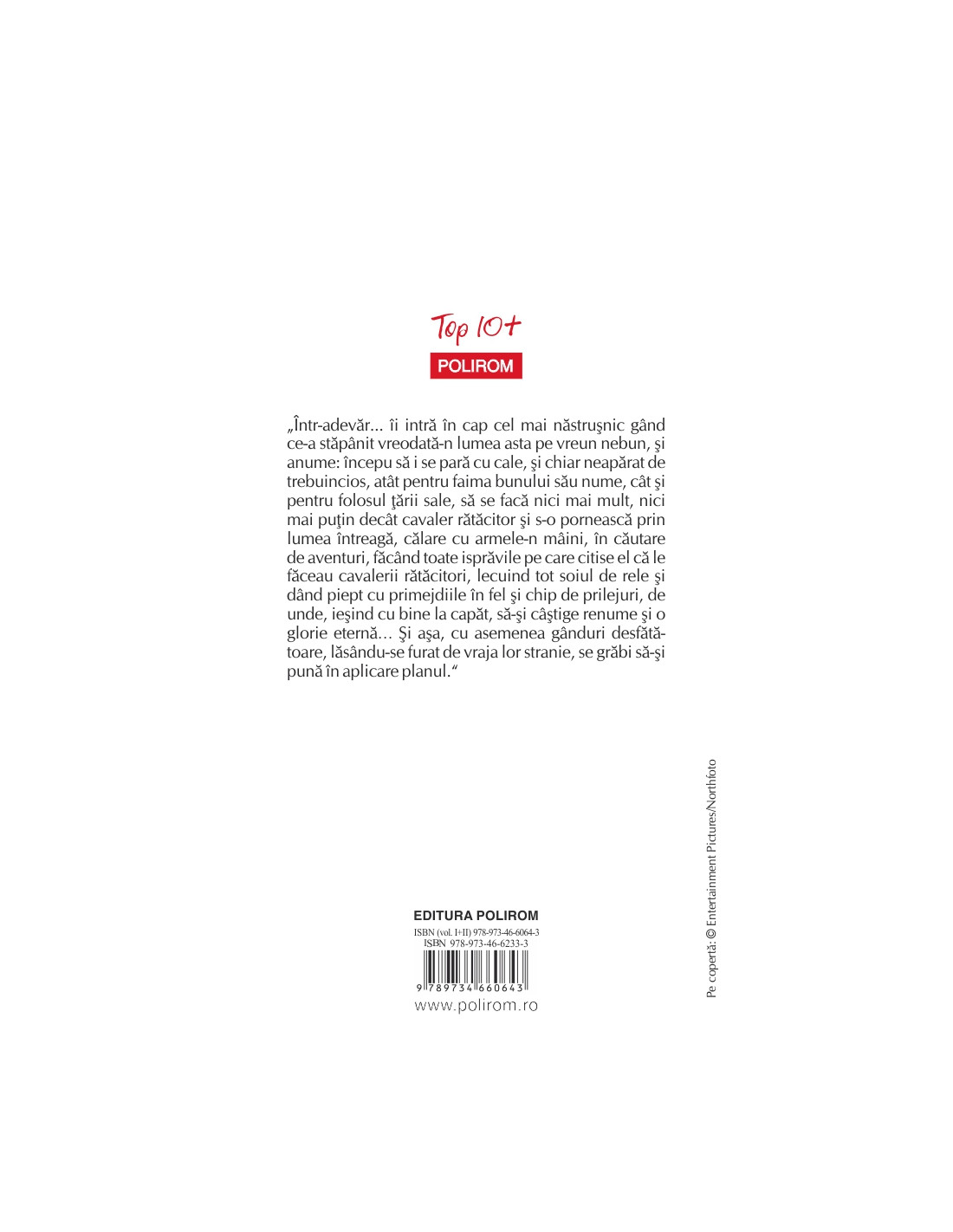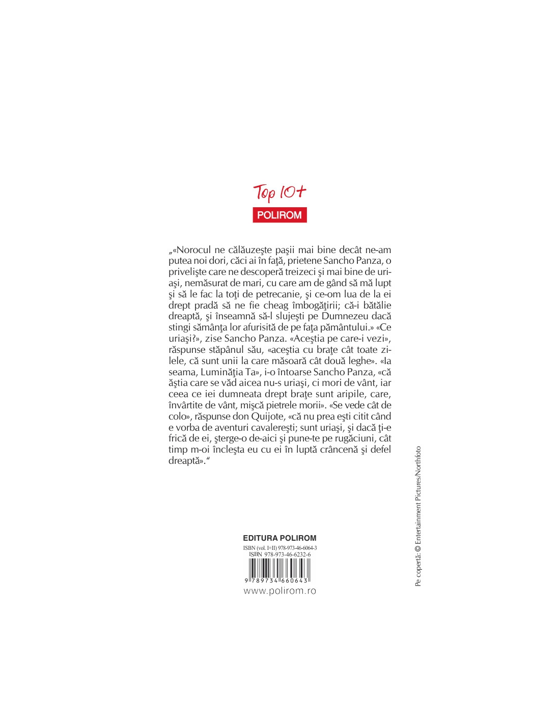 Autori: Miguel de Cervantes„«Norocul ne călăuzeşte paşii mai bine decât ne-am putea noi dori, căci ai în faţă, prietene Sancho Panza, o privelişte care ne descoperă treizeci şi mai bine de uriaşi, nemăsurat de mari, cu care am de gând să mă lupt şi să le fac la toţi de petrecanie, şi ce-om lua de la ei drept pradă să ne fie cheag îmbogăţirii; că-i bătălie dreaptă, şi înseamnă să-l slujeşti pe Dumnezeu dacă stingi sămânţa lor afurisită de pe faţa pământului.» «Ce uriaşi?», zise Sancho Panza. «Aceştia pe care-i vezi», răspunse stăpânul său, «aceştia cu braţe cât toate zilele, că sunt unii la care măsoară cât două leghe». «Ia seama, Luminăţia Ta», i-o întoarse Sancho Panza, «că ăştia care se văd aicea nu-s uriaşi, ci mori de vânt, iar ceea ce iei dumneata drept braţe sunt aripile, care, învârtite de vânt, mişcă pietrele morii». «Se vede cât de colo», răspunse don Quijote, «că nu prea eşti citit când e vorba de aventuri cavalereşti; sunt uriaşi, şi dacă ţi‑e frică de ei, şterge-o de-aici şi pune-te pe rugăciuni, cât timp m-oi încleşta eu cu ei în luptă crâncenă şi defel dreaptă».” (Miguel de Cervantes)