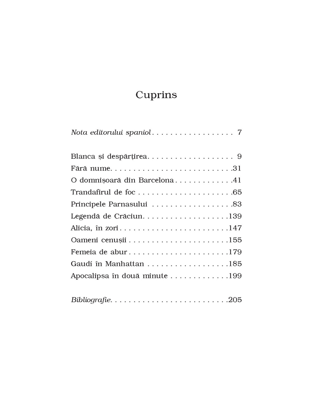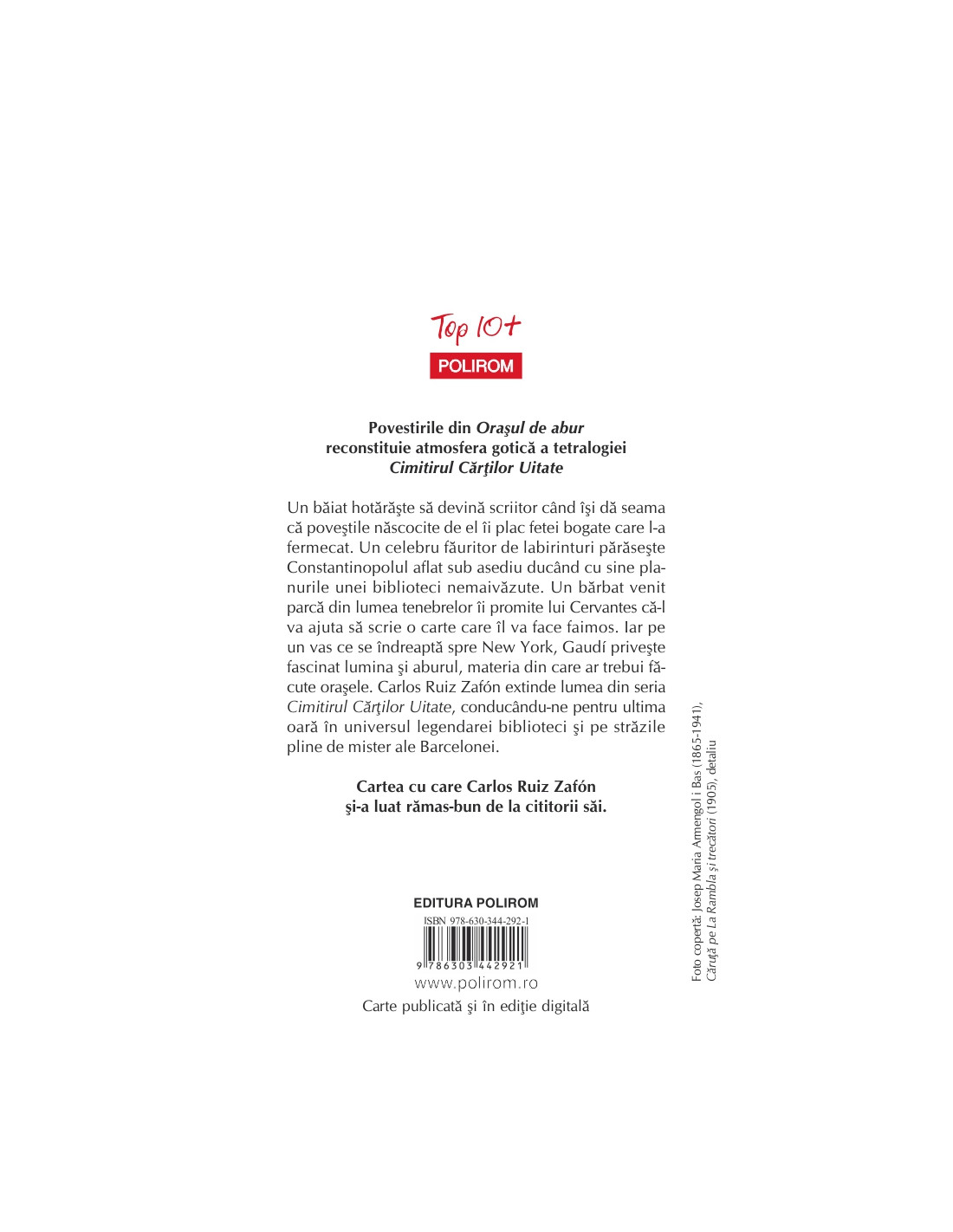 Un băiat hotărăşte să devină scriitor când îşi dă seama că poveştile născocite de el îi plac fetei bogate care l-a fermecat. Un celebru făuritor de labirinturi părăseşte Constantinopolul aflat sub asediu ducând cu sine planurile unei biblioteci nemaivăzute. Un bărbat venit parcă din lumea tenebrelor îi promite lui Cervantes că-l va ajuta să scrie o carte care îl va face faimos. Iar pe un vas ce se îndreaptă spre New York, Gaudí priveşte fascinat lumina şi aburul, materia din care ar trebui făcute oraşele. Carlos Ruiz Zafón extinde lumea din seria Cimitirul Cărţilor Uitate, conducându-ne pentru ultima oară în universul legendarei biblioteci şi pe străzile pline de mister ale Barcelonei.