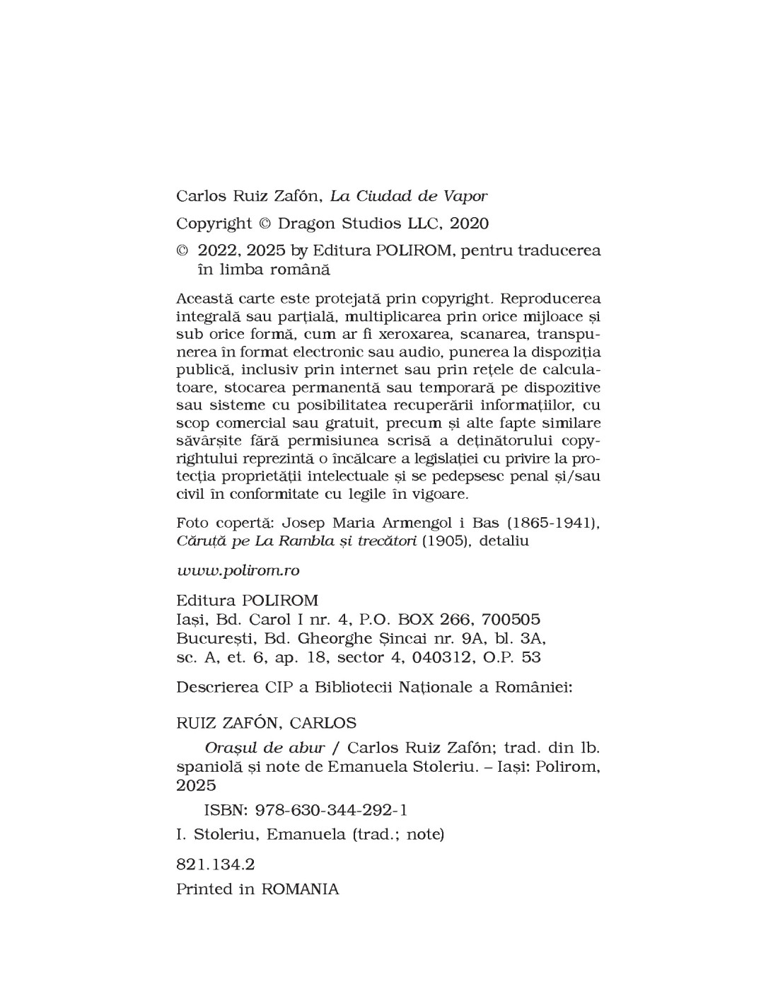 Carlos RUIZ ZAFÓN (1964‑2020) a fost unul dintre cei mai apreciaţi scriitori spanioli ai generaţiei sale. A lucrat în publicitate şi a colaborat la reviste prestigioase, precum La Vanguardia sau El País. Pentru câţiva ani, a locuit la Los Angeles, scriind scenarii de film. Şi‑a început cariera literară în 1993, cu o carte pentru copii, Prinţul din negură (Polirom, 2011, 2015, 2017), pentru care i s‑a decernat Premiul Edebé. I‑au urmat romanele Palatul de la Miazănoapte (1994; Polirom, 2011, 2015, 2017), Luminile din septembrie (1995; Polirom, 2012, 2017), Marina (1999; Polirom, 2010, 2013, 2018), Umbra vântului (2001; Polirom, 2005, 2013, 2023), distins cu Prix du Meilleur Livre Étranger în 2004, şi Jocul îngerului (2008; Polirom, 2009, 2013, 2023). În anul 2011 a apărut Prizonierul cerului (Polirom, 2012, 2013), iar în 2016, Labirintul spiritelor (Polirom, 2018). În 2020 a publicat volumul de povestiri Oraşul de abur (Polirom, 2022), cu care şi‑a luat rămas-bun de la cititorii săi.