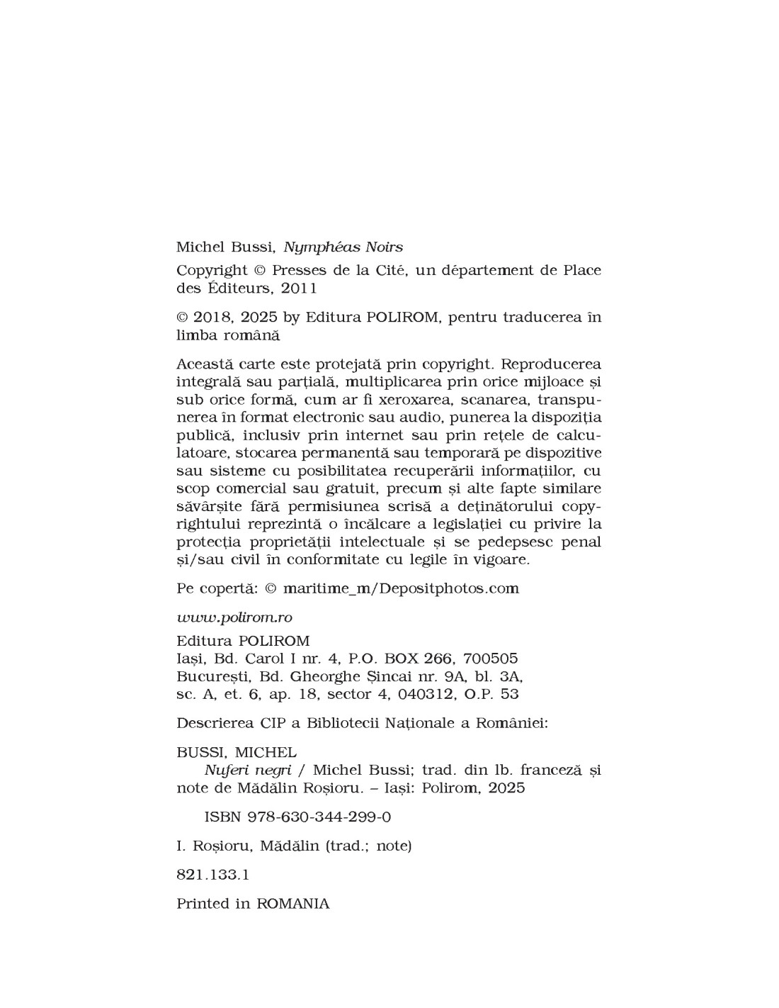 Giverny. În timpul zilei, turiştii iau cu asalt casa în care Claude Monet şi-a trăit ultima parte a vieţii şi grădinile ce au inspirat faimoasele sale tablouri cu nuferi. Dar când se lasă tăcerea, satul acesta mic şi liniştit îşi dezvăluie partea întunecată. Nuferi negri spune o poveste care începe şi se încheie cu o crimă. Jérôme Morval, un bărbat a cărui pasiune pentru artă n-o întrece decât cea pentru femei, este găsit mort în pârâul care străbate grădinile lui Monet, având în buzunar o ilustrată ce reproduce un tablou cu nuferi şi pe care sunt scrise cuvintele Unsprezece ani. La mulţi ani. În firele misterului sunt prinse trei personaje feminine: o fetiţă talentată pasionată de pictură, seducătoarea învăţătoare a satului şi o bătrână care pare să ştie prea multe despre viaţa celor din jur. Toate împărtăşesc acelaşi secret. Dar ce le leagă pe ele de moartea lui Jérôme Morval? Şi ce legătură au toate astea cu misteriosul tablou cu nuferi negri?
