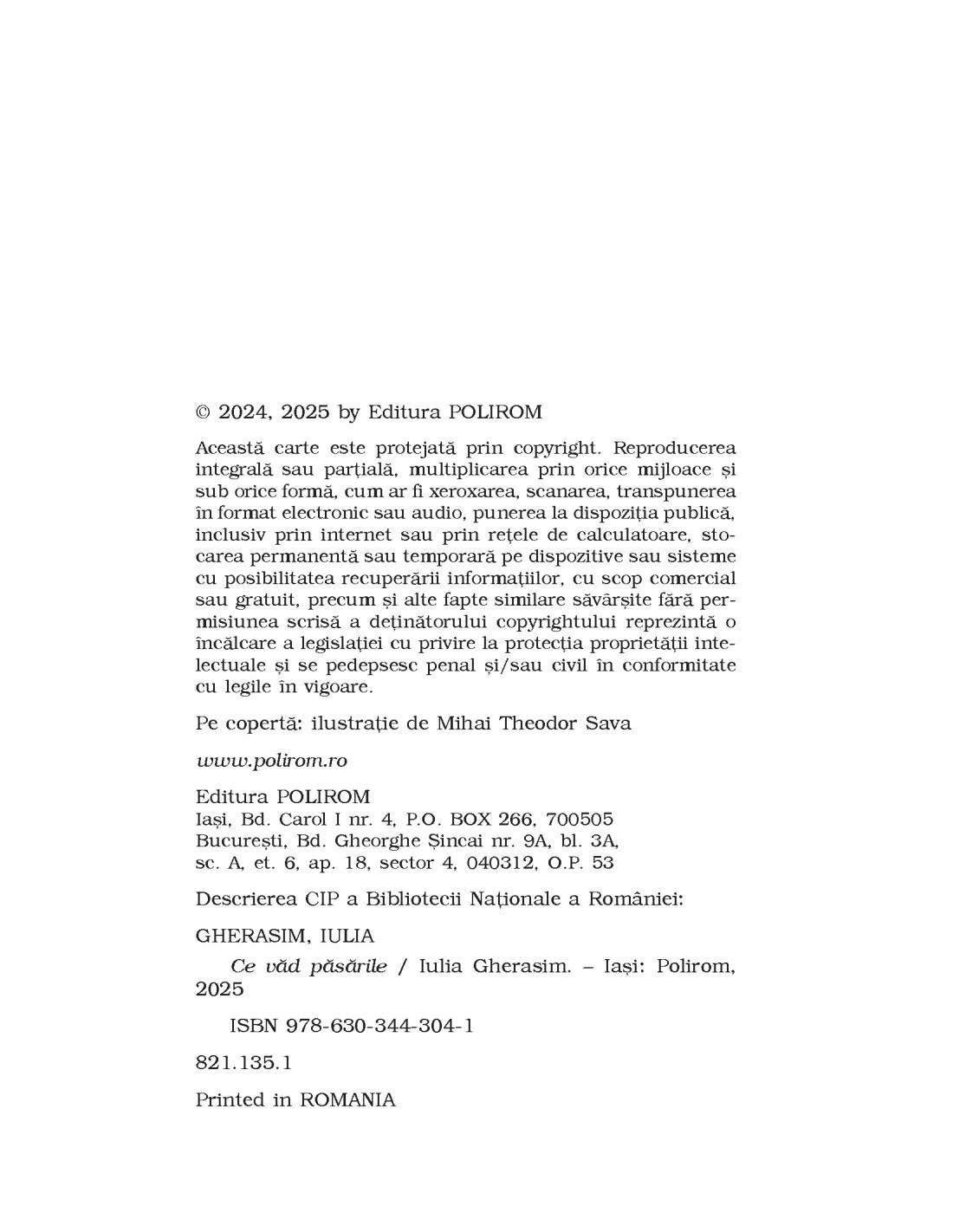 Iulia GHERASIM (n. 1982, Ploieşti) a absolvit Facultatea de Relaţii Economice Internaţionale din cadrul ASE Bucureşti şi Facultatea de Drept a Universităţii „Nicolae Titulescu“. În 2014 a urmat cursul de creative writing susţinut de Florin Iaru şi Marius Chivu, iar în 2017 a fost selectată în programul de mentorat „Prima Carte”, organizat de Fundaţia „Friends for Friends”. A publicat povestiri în antologiile KIWI, Lucruri mărunte. Copilăria în comunism (vol II), Retroversiuni şi în revistele Iocan şi Timpul. Volumul său de debut, Ce văd păsările (ediţia I, 2024), a câştigat Premiul Uniunii Scriitorilor din România, categoria Debut, ediţia 2025, Premiul Cartea de Proză a anului 2024, decernat de Agenţia de Carte, ediţia 2025, şi a fost nominalizat la Premiile Observator cultural pentru debut, ediţia 2025.