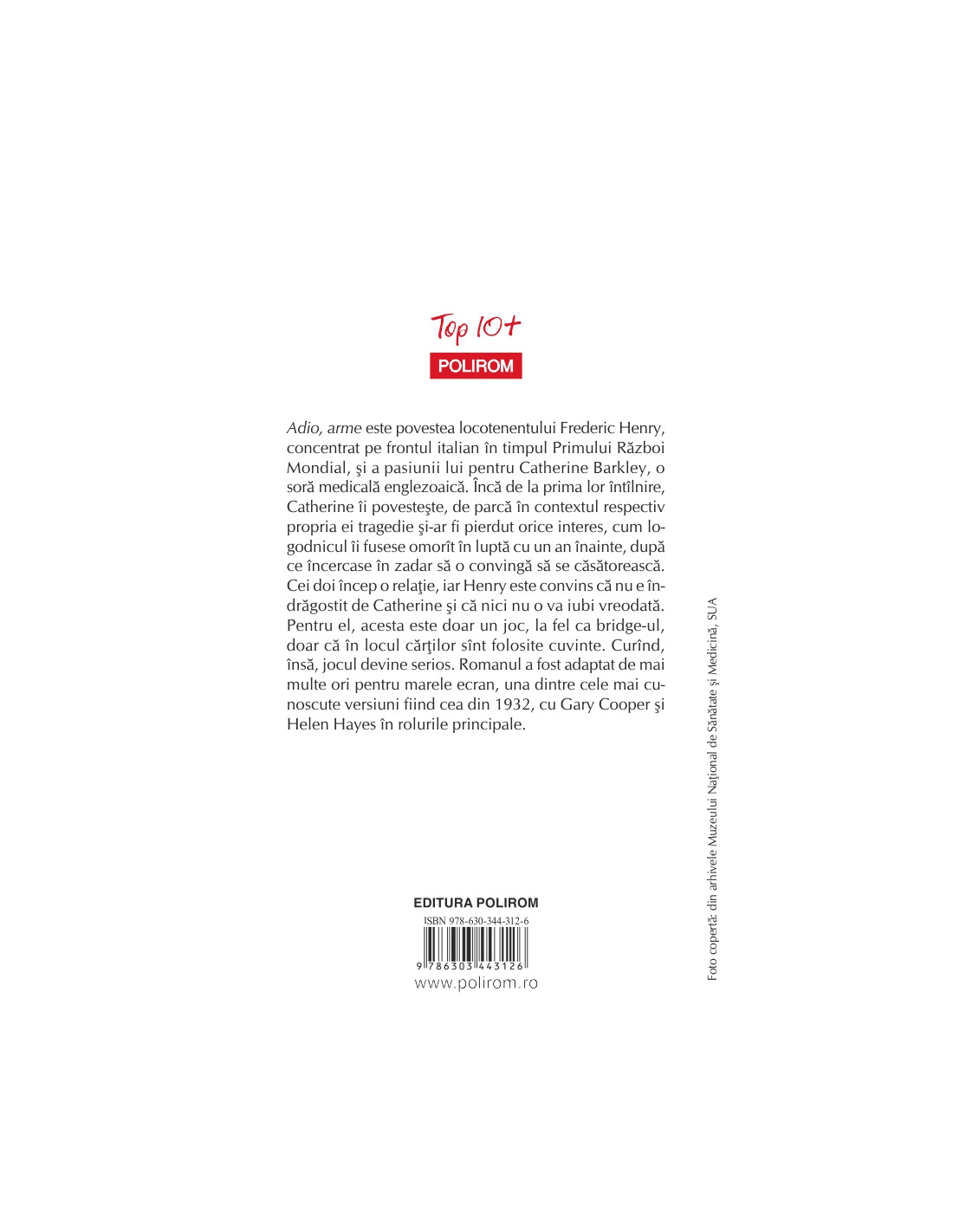 Adio, arme este povestea locotenentului Frederic Henry, concentrat pe frontul italian în timpul Primului Război Mondial, şi a pasiunii lui pentru Catherine Barkley, o soră medicală englezoaică. Încă de la prima lor întâlnire, Catherine îi povesteşte, de parcă în contextul respectiv propria ei tragedie şi-ar fi pierdut orice interes, cum logodnicul îi fusese omorât în luptă cu un an înainte, după ce încercase în zadar să o convingă să se căsătorească. Cei doi încep o relaţie, iar Henry este convins că nu e îndrăgostit de Catherine şi că nici nu o va iubi vreodată. Pentru el, acesta este doar un joc, la fel ca bridge-ul, doar că în locul cărţilor sunt folosite cuvinte. Curând, însă, jocul devine serios. Romanul a fost adaptat de mai multe ori pentru marele ecran, una dintre cele mai cunoscute versiuni fiind cea din 1932, cu Gary Cooper şi Helen Hayes în rolurile principale.