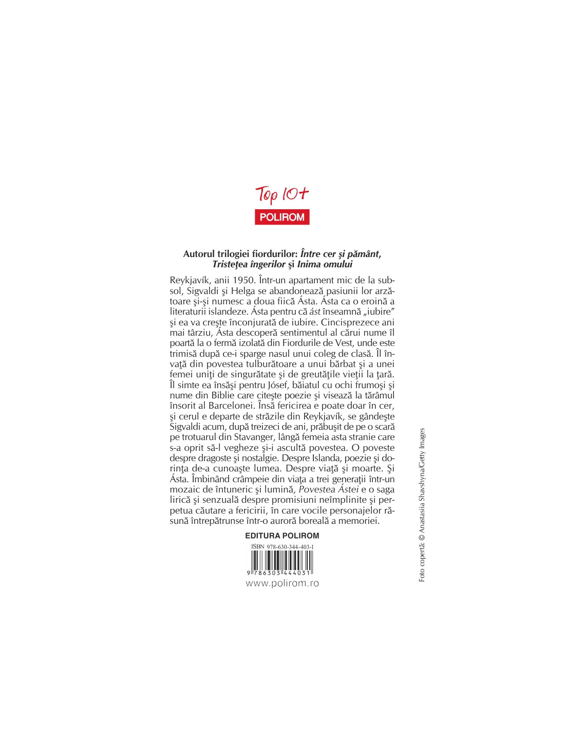 Reykjavík, anii 1950. Într-un apartament mic de la subsol, Sigvaldi şi Helga se abandonează pasiunii lor arzătoare şi-şi numesc a doua fiică Ásta. Ásta ca o eroină a literaturii islandeze. Ásta pentru că ást înseamnă „iubire” şi ea va creşte înconjurată de iubire. Cincisprezece ani mai târziu, Ásta descoperă sentimentul al cărui nume îl poartă la o fermă izolată din Fiordurile de Vest, unde este trimisă după ce-i sparge nasul unui coleg de clasă. Îl învaţă din povestea tulburătoare a unui bărbat şi a unei femei uniţi de singurătate şi de greutăţile vieţii la ţară. Îl simte ea însăşi pentru Jósef, băiatul cu ochi frumoşi şi nume din Biblie care citeşte poezie şi visează la tărâmul însorit al Barcelonei. Însă fericirea e poate doar în cer, şi cerul e departe de străzile din Reykjavík, se gândeşte Sigvaldi acum, după treizeci de ani, prăbuşit de pe o scară pe trotuarul din Stavanger, lângă femeia asta stranie care s-a oprit să-l vegheze şi-i ascultă povestea. O poveste despre dragoste şi nostalgie. Despre Islanda, poezie şi dorinţa de-a cunoaşte lumea. Despre viaţă şi moarte. Şi Ásta. Îmbinând crâmpeie din viaţa a trei generaţii într-un mozaic de întuneric şi lumină, Povestea Ástei e o saga lirică şi senzuală despre promisiuni neîmplinite şi perpetua căutare a fericirii, în care vocile personajelor răsună întrepătrunse într-o auroră boreală a memoriei.